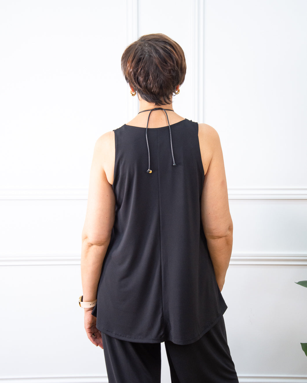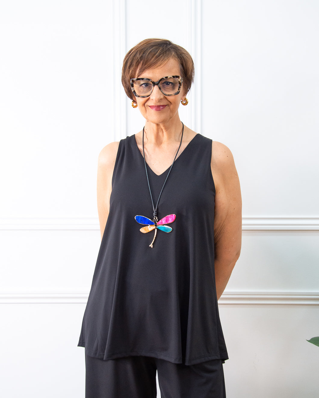 Blusa de seda fría básica, forma evasé, lleva el tirante ancho para que tape la tira del sujetador. Ideal para hacer conjunto con el pantalón y la chaqueta a juego.