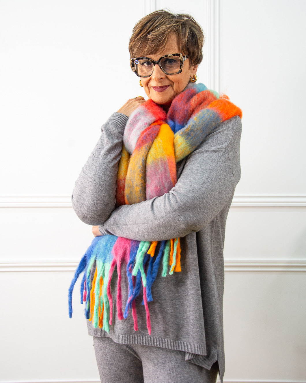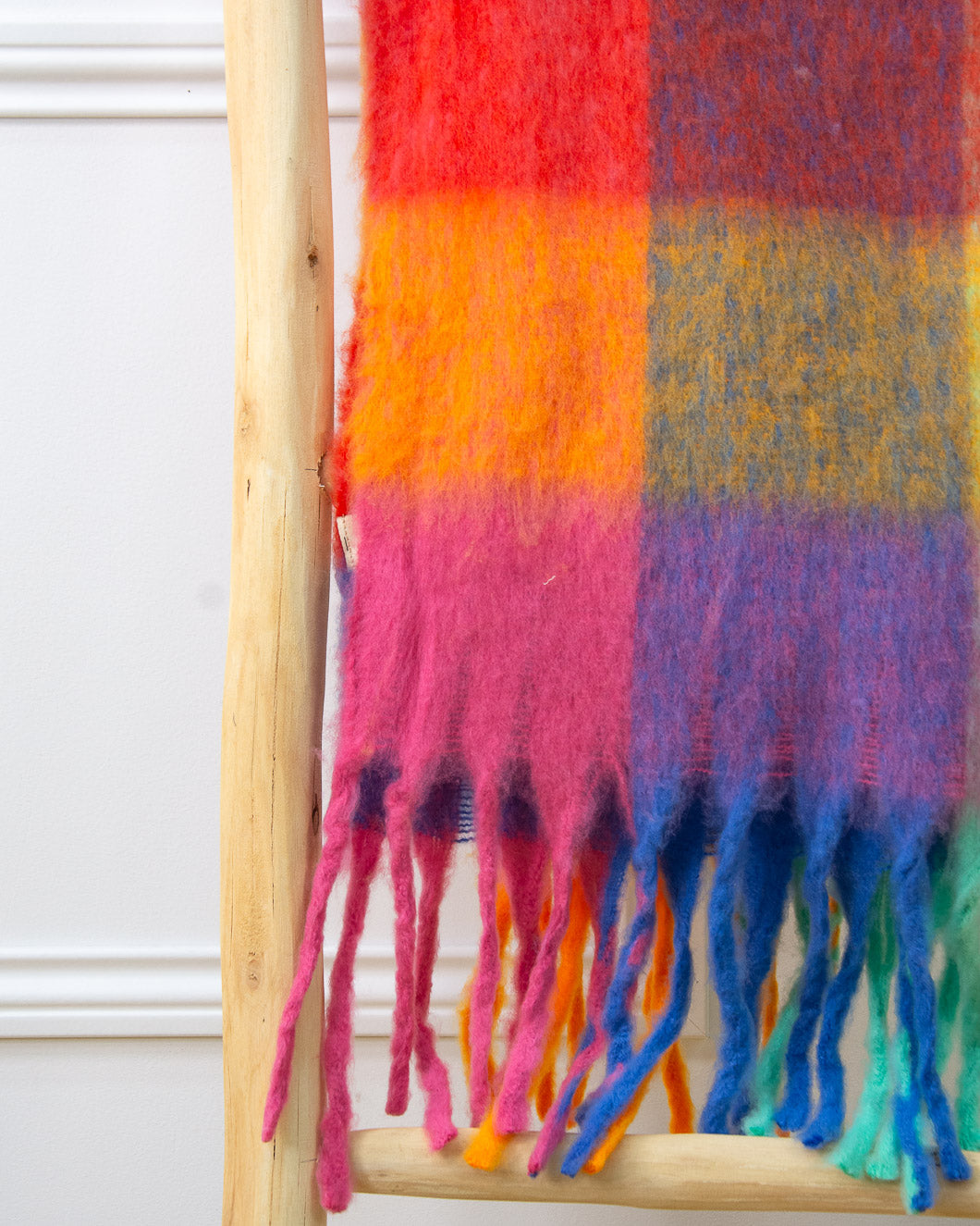 composición 90% acrílico, 10% lana. Color único multicolor. Medidas: 55x100, flecos de 15cm. 6 unidades.