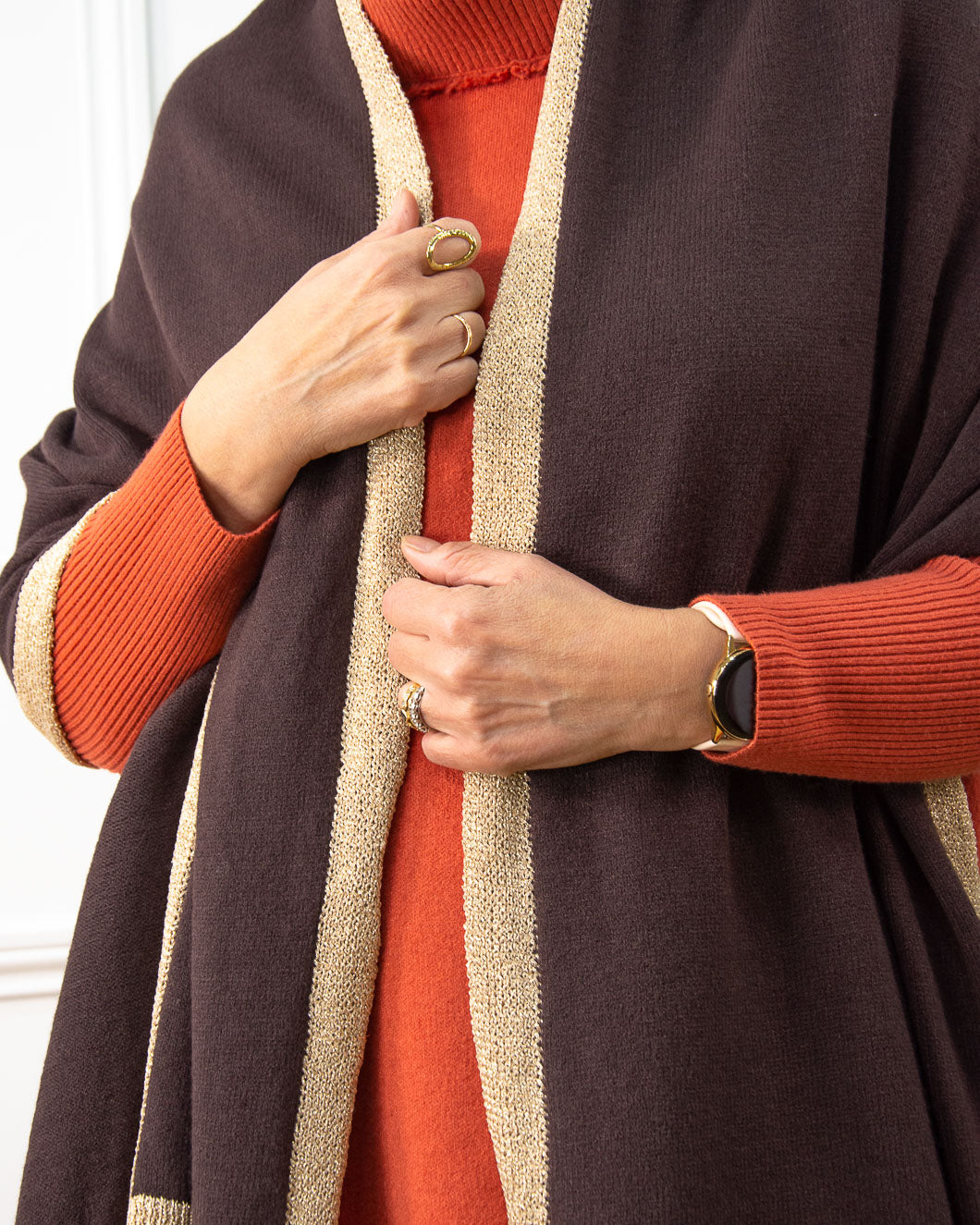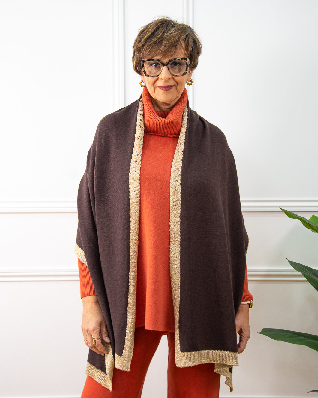 composición 70% acrílico, 20% lana, 10%lúrex. Color único marrón. Medidas 180x60cm. 6 unidades.