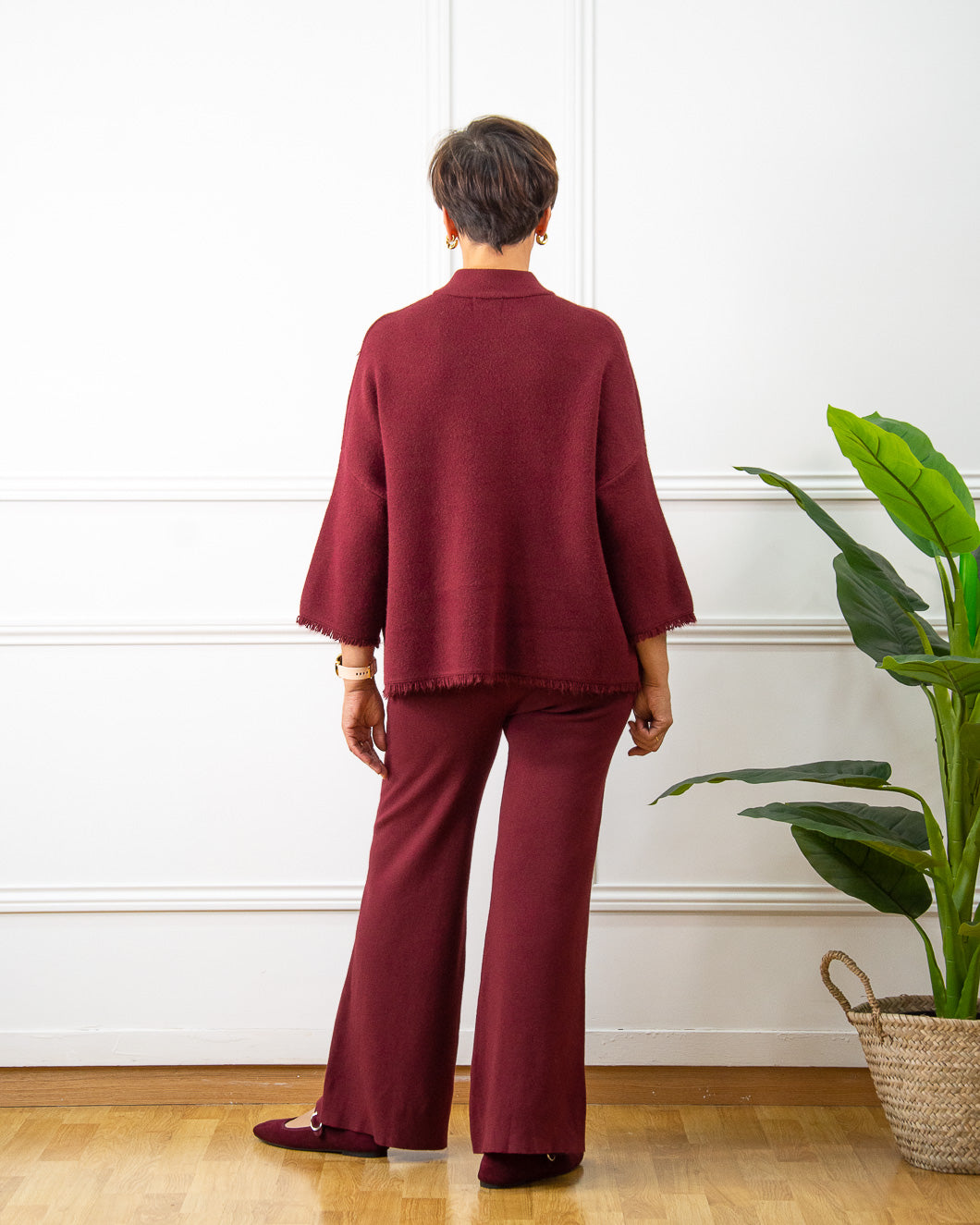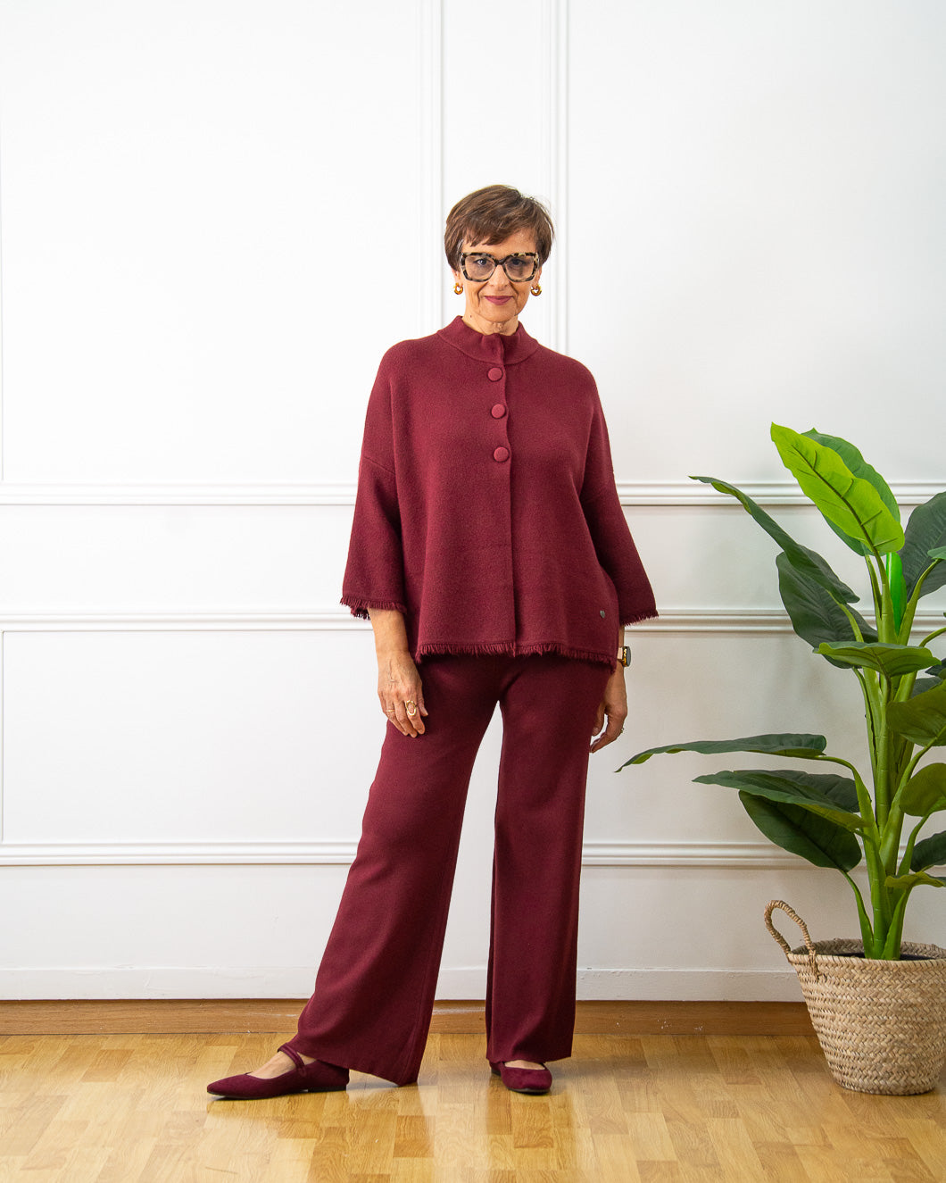 Chaqueta de doble punto, el tacto es muy suave, lleva cuello de tira con broche invisible, se abrocha con tres botones forrados. La manga no llega hasta abajo para mostrar la prenda que va debajo. El bajo y las mangas terminan con un mini fleco.