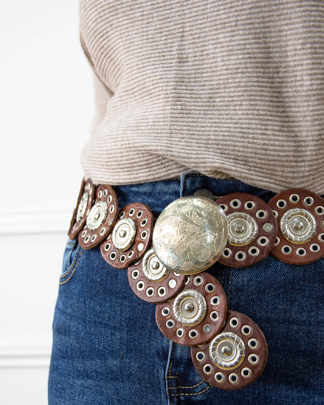 Cinturón de piel con hebilla de chapa , abrocha en cualquier ollado, largo total 114cm, ancho 5.5 cm