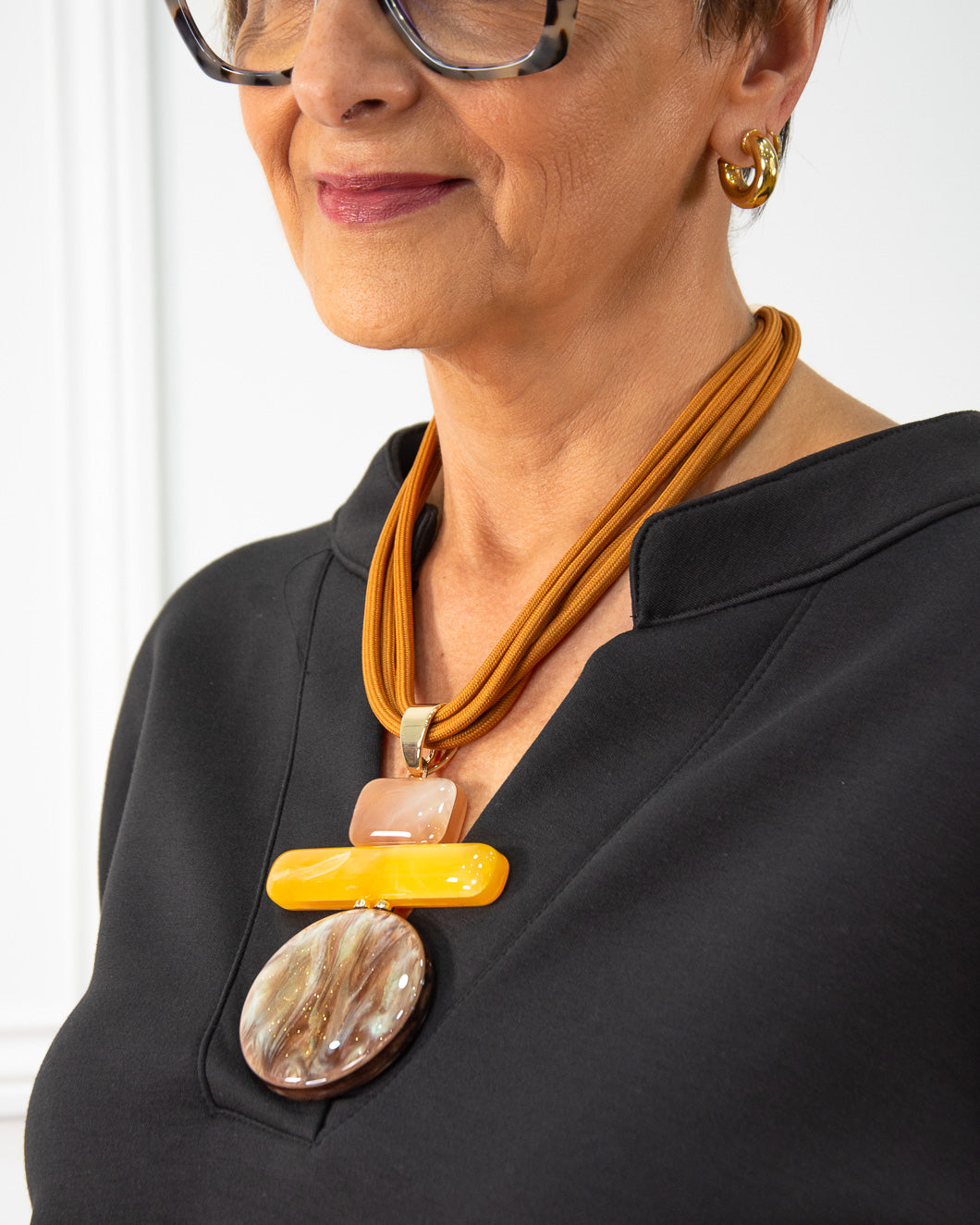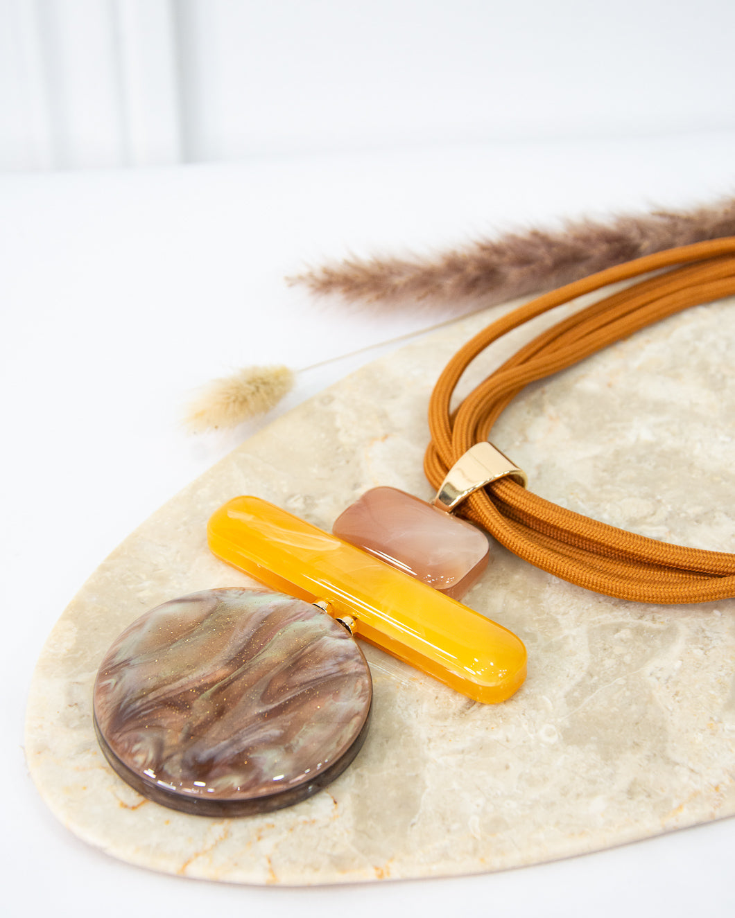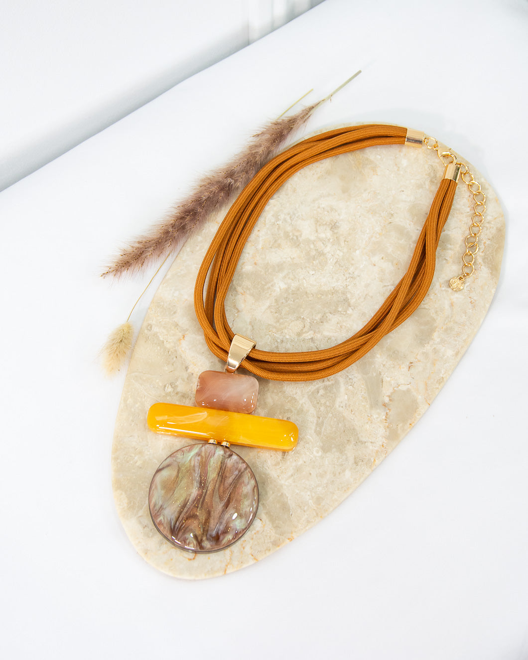 Colgante de resina , lleva cuatro tiras de algodón tubulares combinando los colores con la pieza central, ideal para resaltar un look básico.