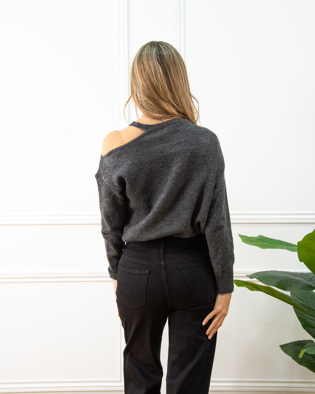 Jersey con el escote asimétrico, lleva adornos termosellados alrededor del escote, es muy mullido y suave al tacto.