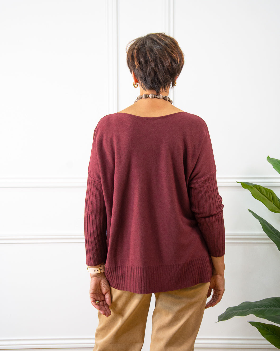 Jersey oversize, cuello barco, manga caída de canalé, no llega hasta la muñeca, lleva un elástico de canalé en la parte de abajo , tiene muchísima caída y no se queda pegado. Disponible en cuatro colores, azul jean, rojo, buganvilla y arena.