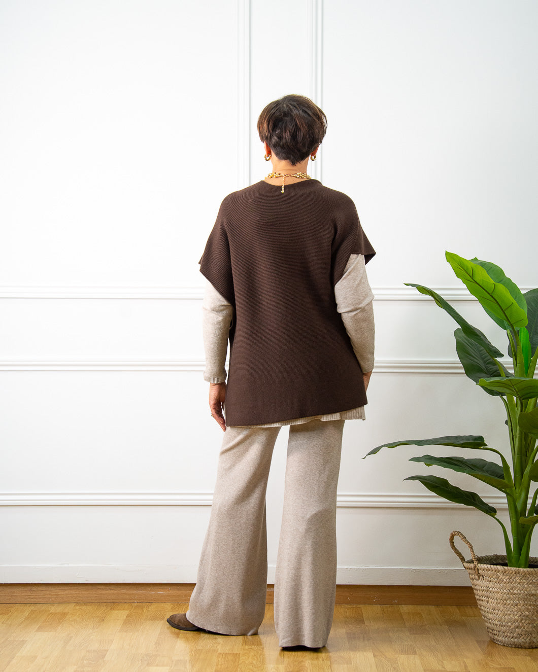 Poncho abierto, los laterales van cerrados con un botón y ojal, lleva una trabilla en la parte izquierda para meter un lado del delantero y obtener un adorno tipo lazo. Tacto ultra suave.