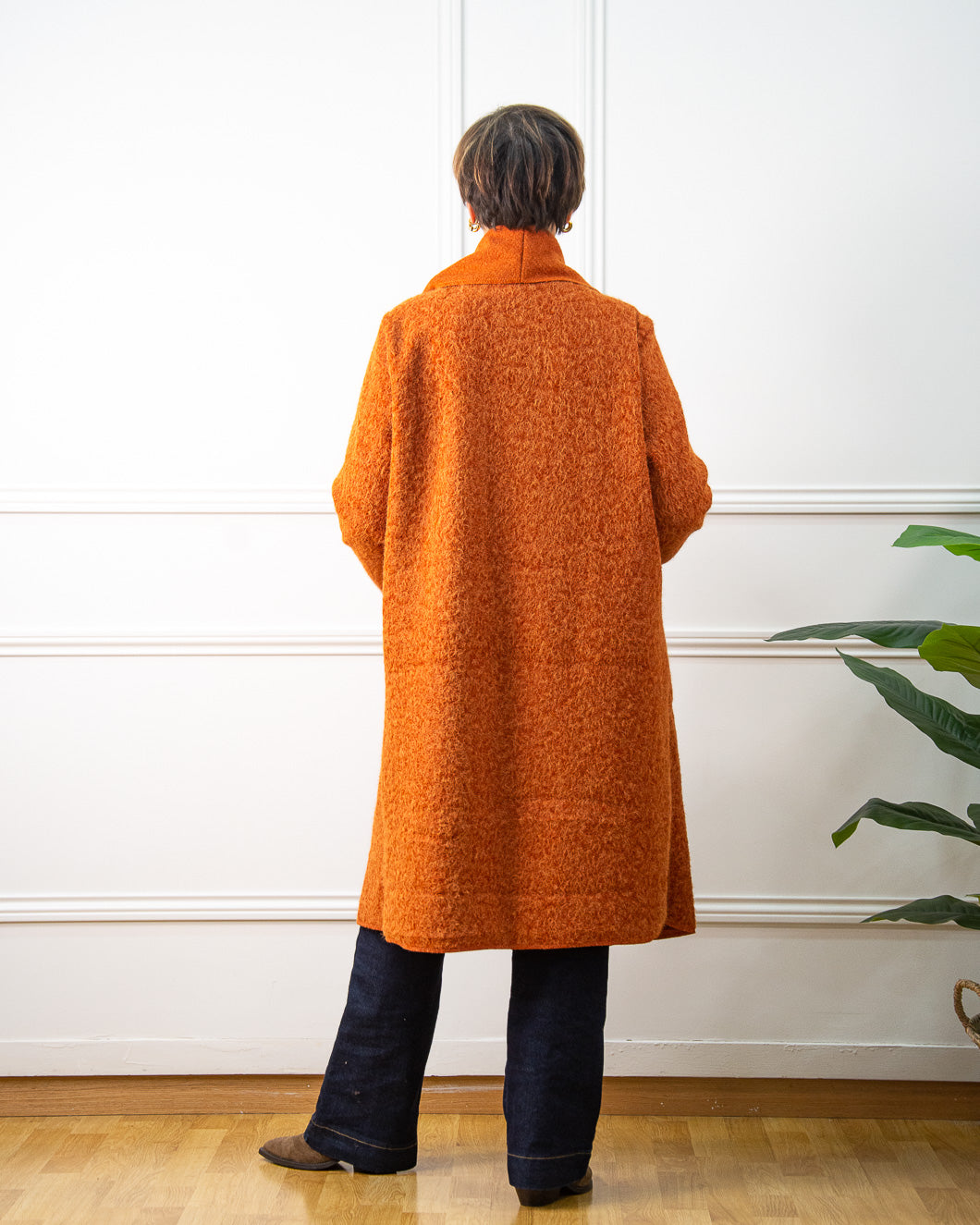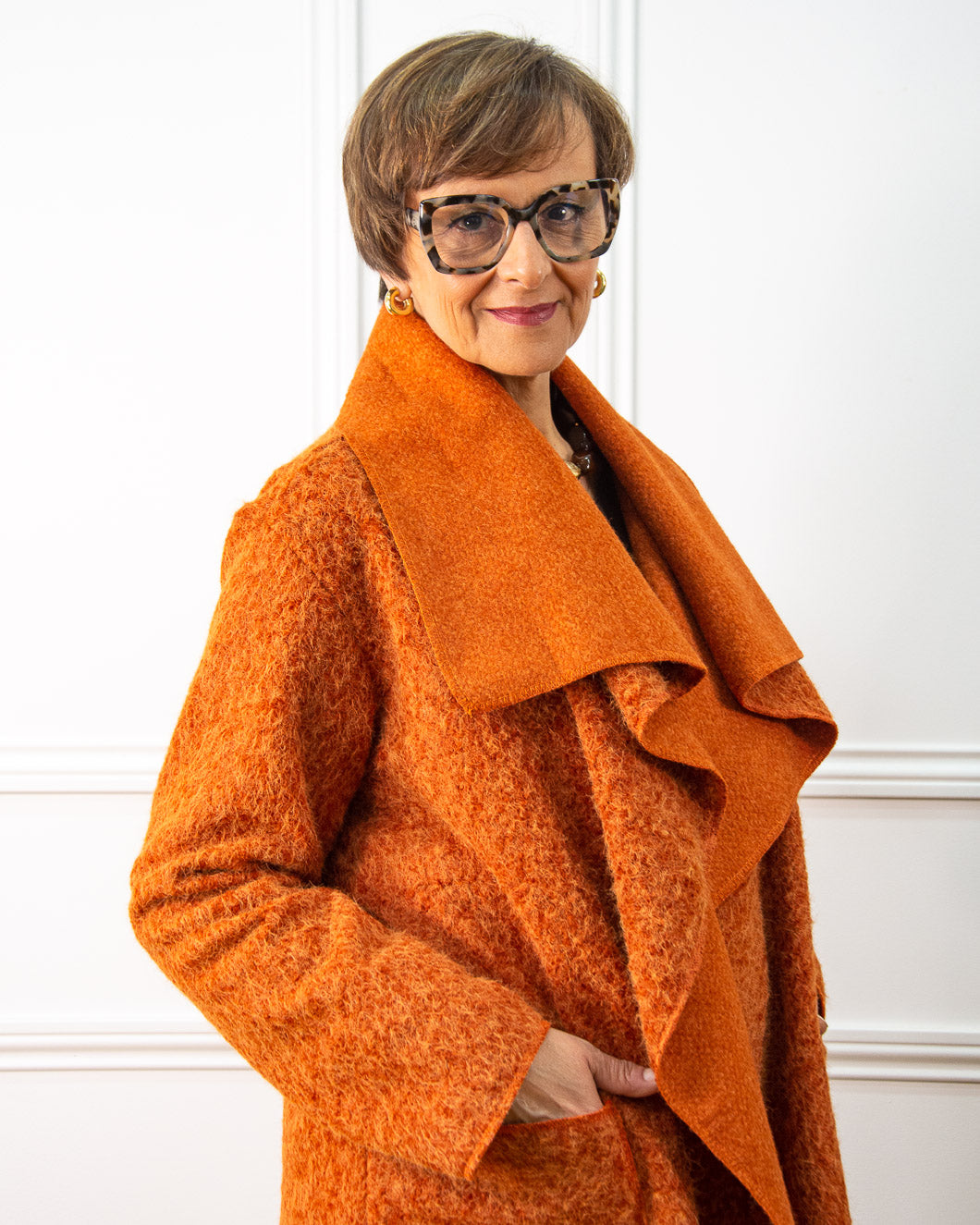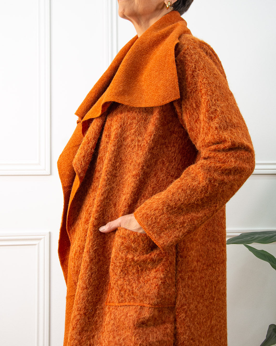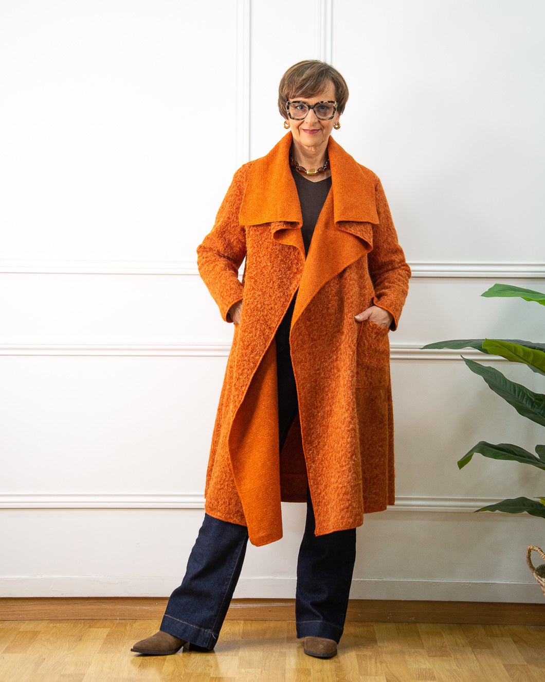 Abrigo con cuello trapecio, no lleva forro ni botones, bolsillos delanteros. Ideal para llevarlo con cinturón multitalla.
