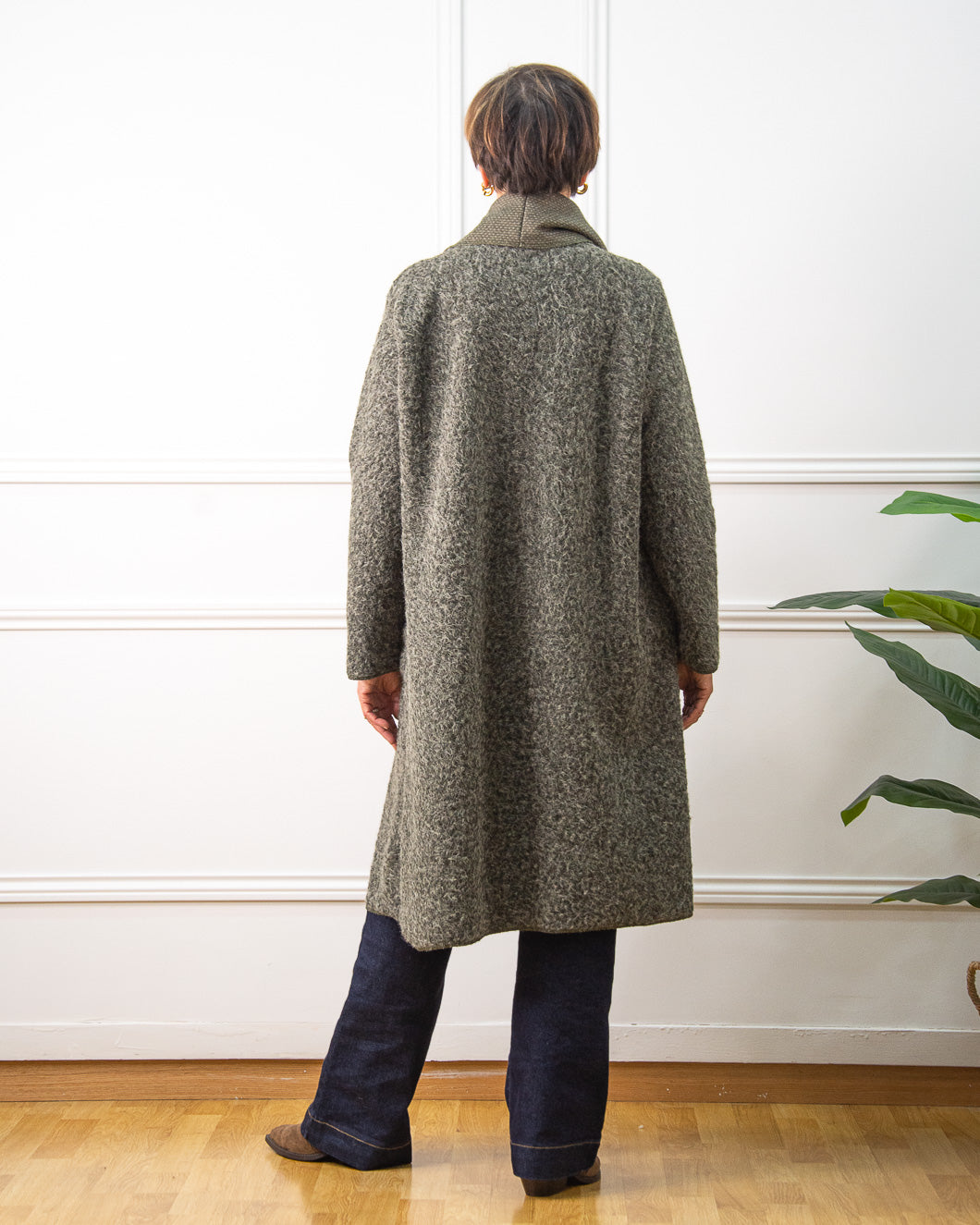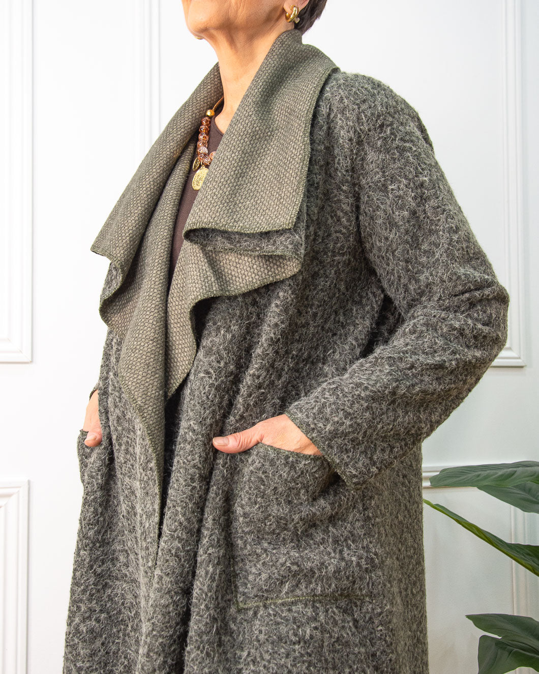 Abrigo con cuello trapecio, no lleva forro ni botones, bolsillos delanteros. Ideal para llevarlo con cinturón multitalla.
