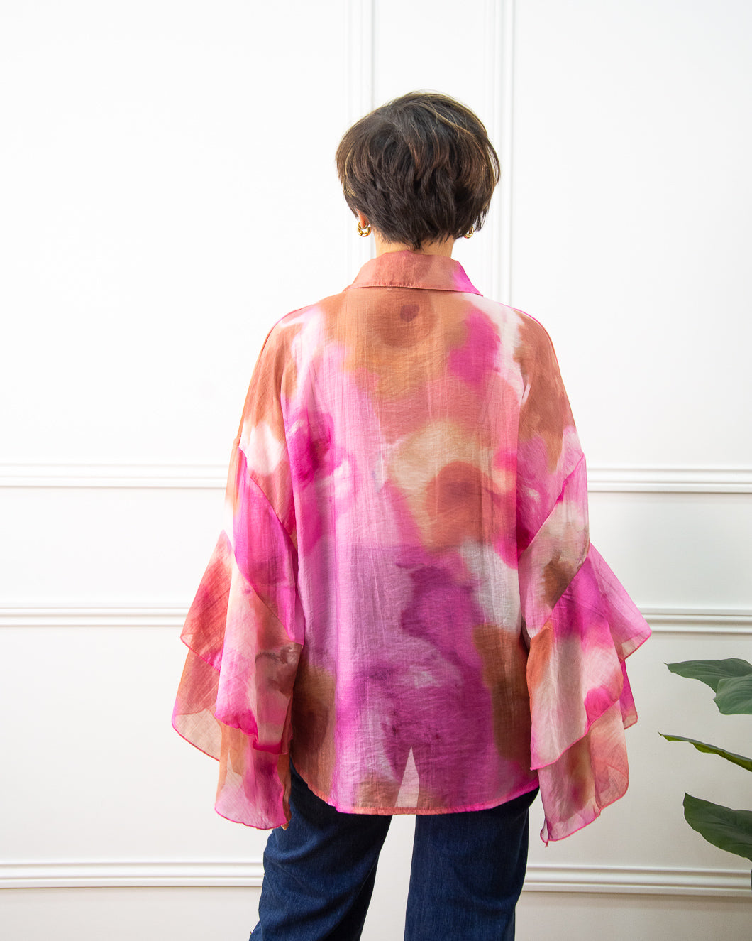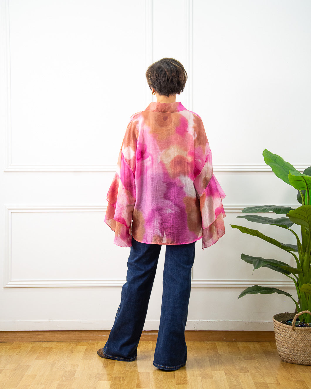 Blusa de cuello camisero abierta por delante, mangas con doble volante al bies, tacto de organza, ideal para un look arreglado, no se arruga.