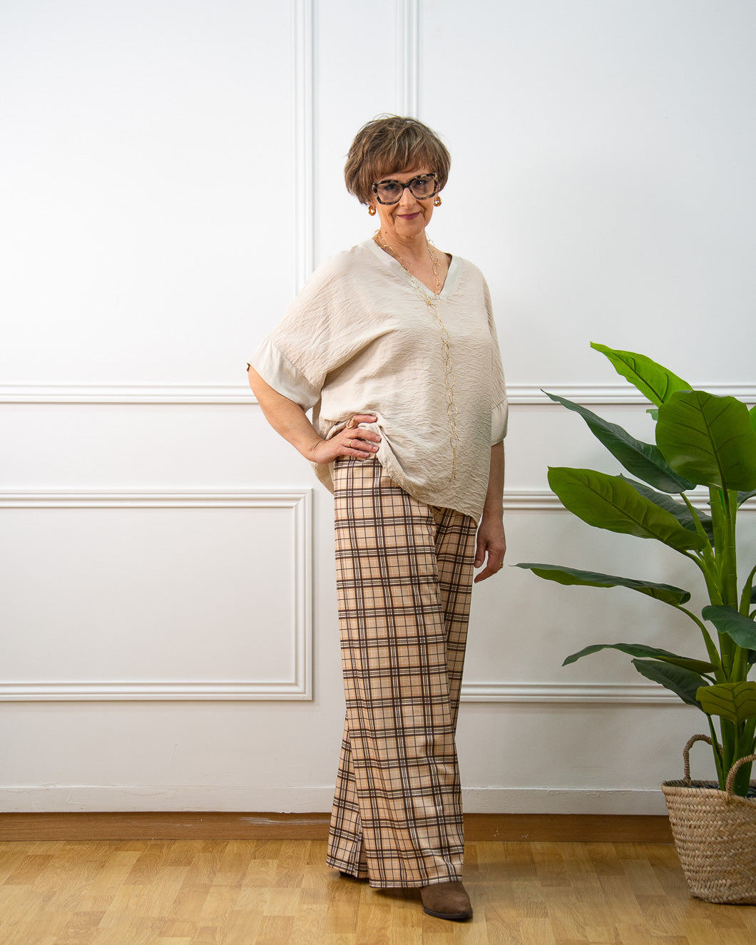 Blusa oversize lisa cuello pico y manga corta , lleva los remates del cuello y de las mangas de raso al tono. Ideal para tallas grandes.