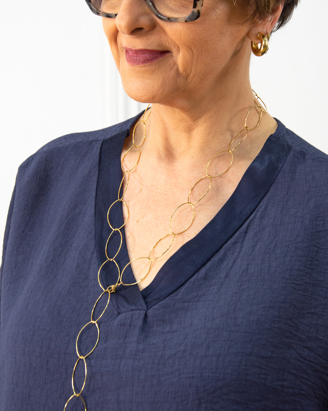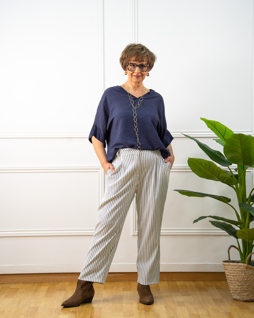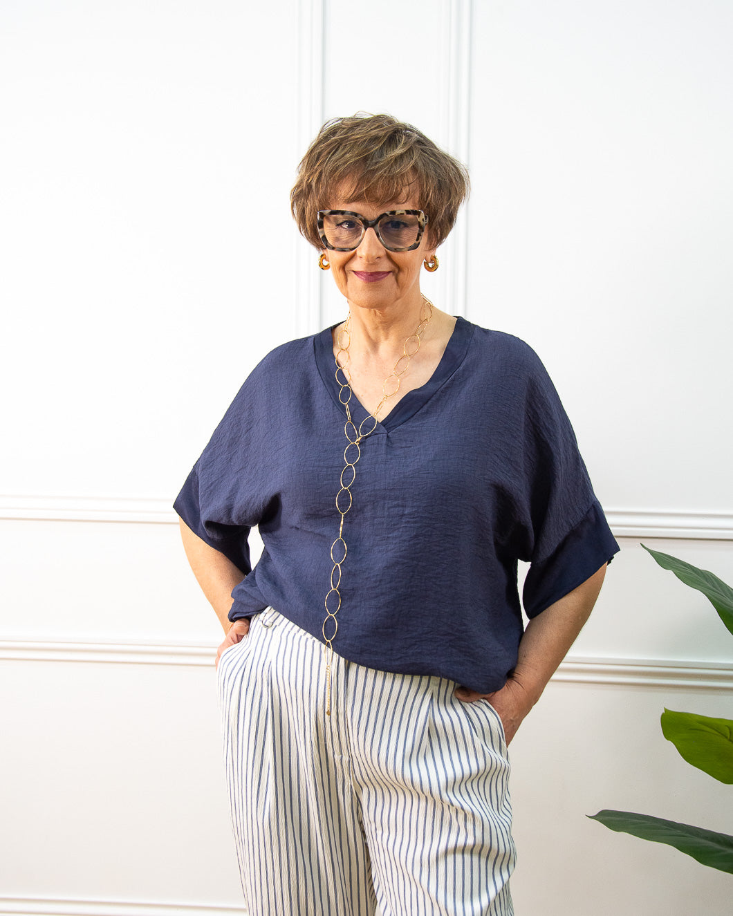 Blusa over size lisa cuello pico y manga corta, lleva los remates del cuello y de las mangas de raso al tono. Ideal para tallas grandes.
