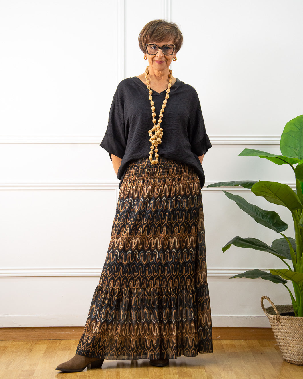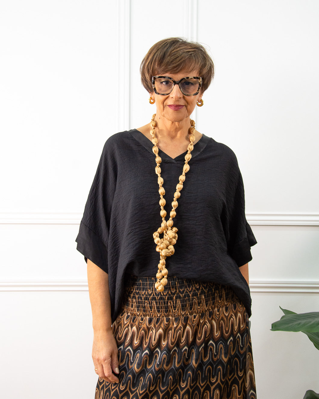 Blusa oversize lisa cuello pico y manga corta, lleva los remates del cuello y de las mangas de raso al tono. Ideal para tallas grandes.