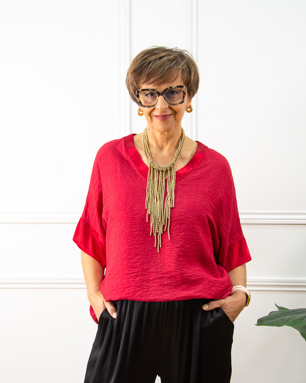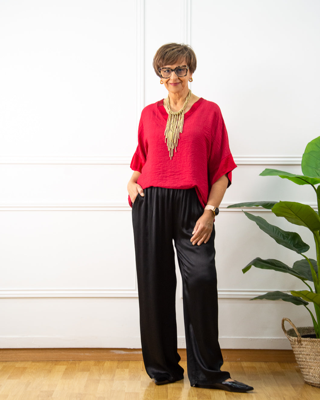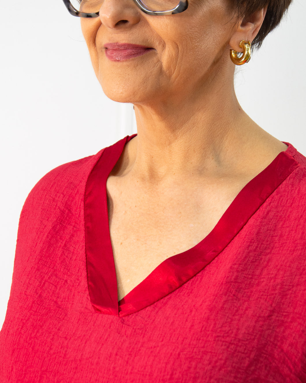Blusa oversize lisa cuello pico y manga corta, lleva los remates del cuello y de las mangas de raso al tono. Ideal para tallas grandes.