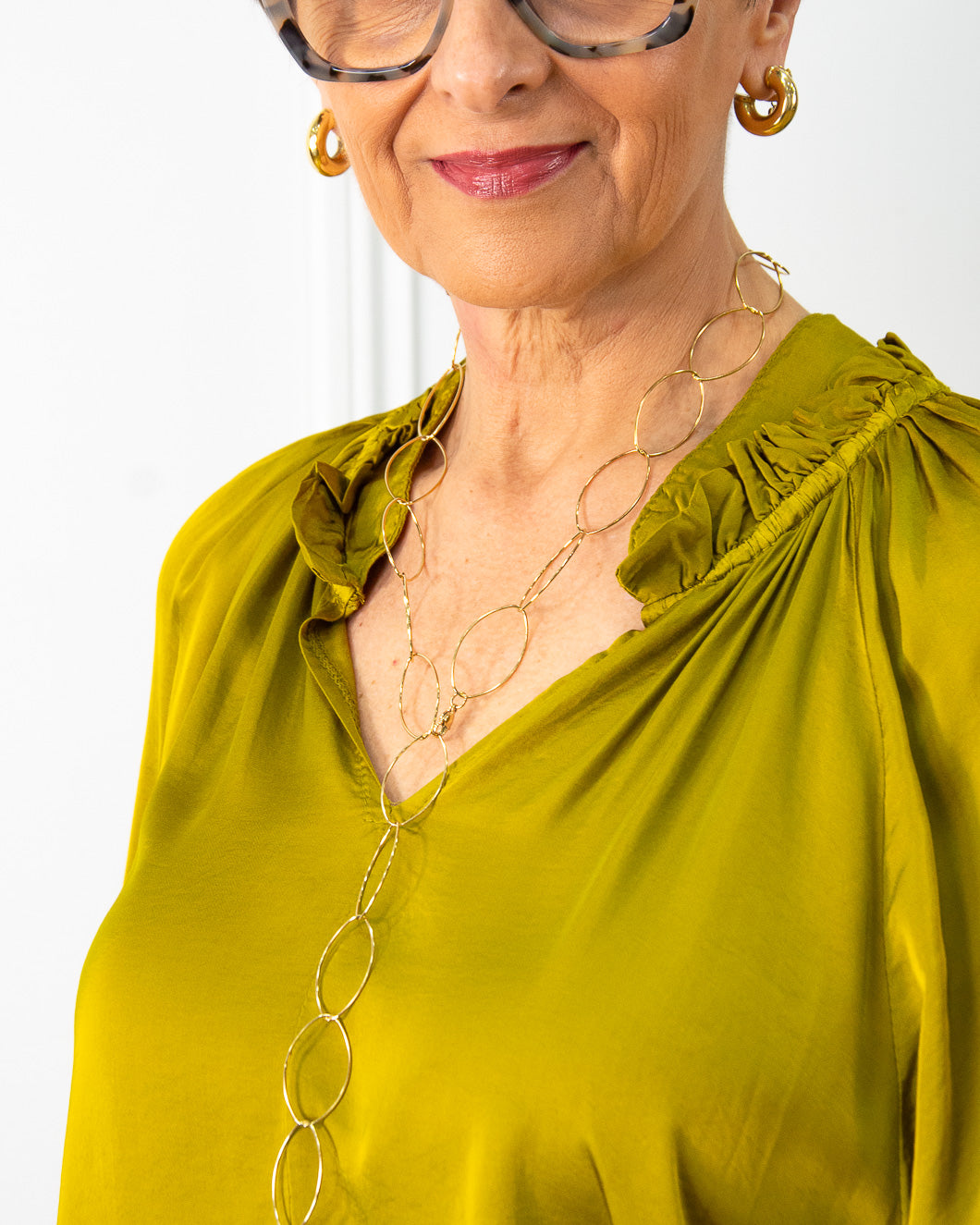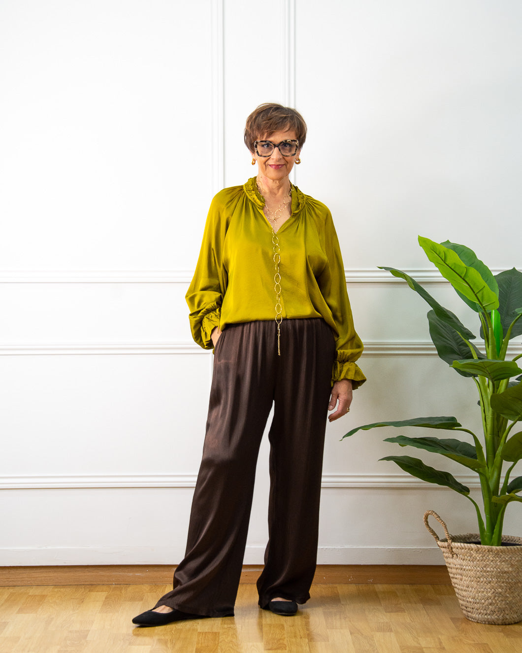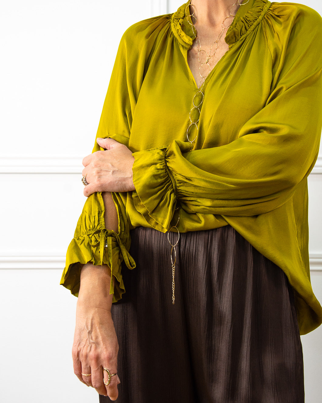 Blusa efecto seda, lleva el cuello adornado con un volantito a juego con el puño que termina en volante con goma y lazo. Es ideal para un look de vestir con faldas estampadas y pantalones bombacho.