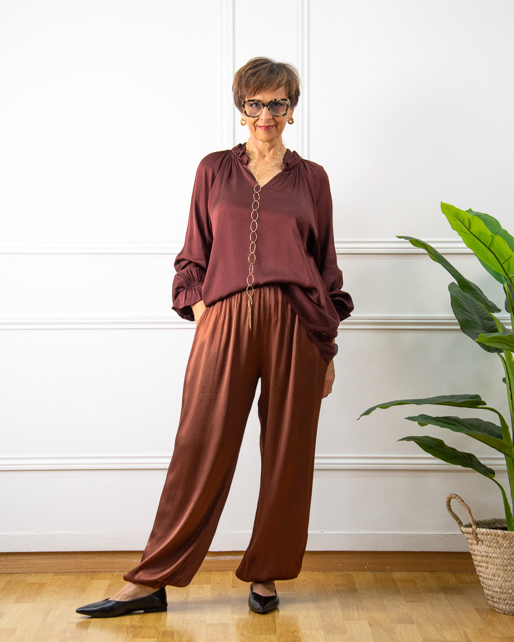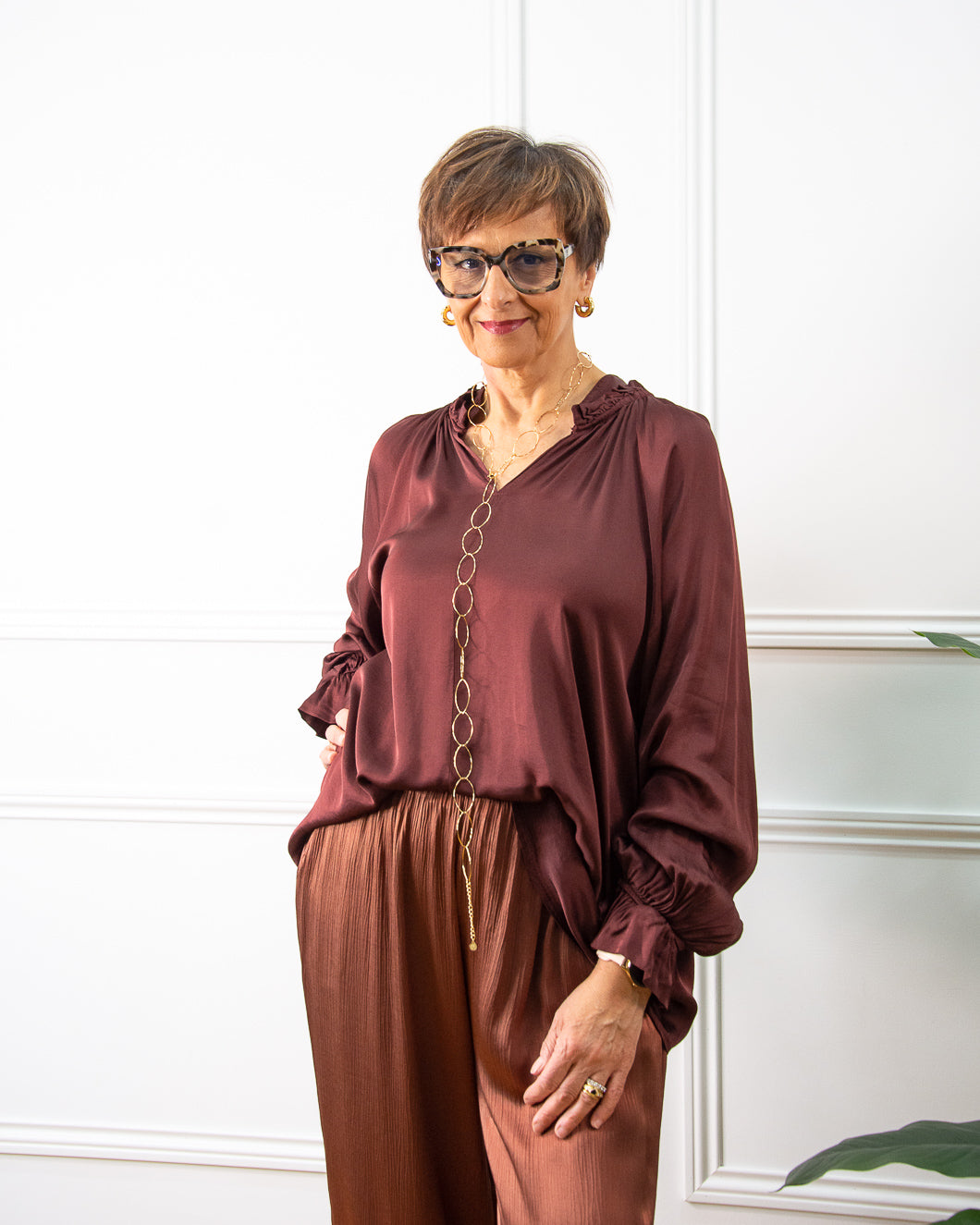 Blusa efecto seda, lleva el cuello adornado con un volantito a juego con el puño que termina en volante con goma y lazo. Es ideal para un look de vestir con faldas estampadas y pantalones bombacho.
