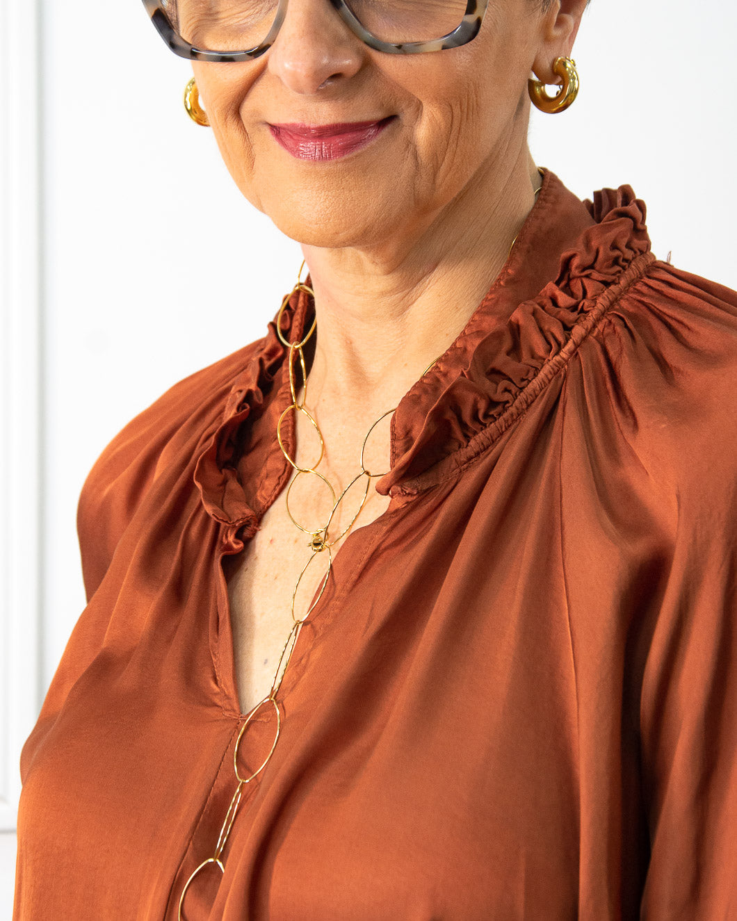Blusa efecto seda, lleva el cuello adornado con un volantito a juego con el puño que termina en volante con goma y lazo. Es ideal para un look de vestir con faldas estampadas y pantalones bombacho.