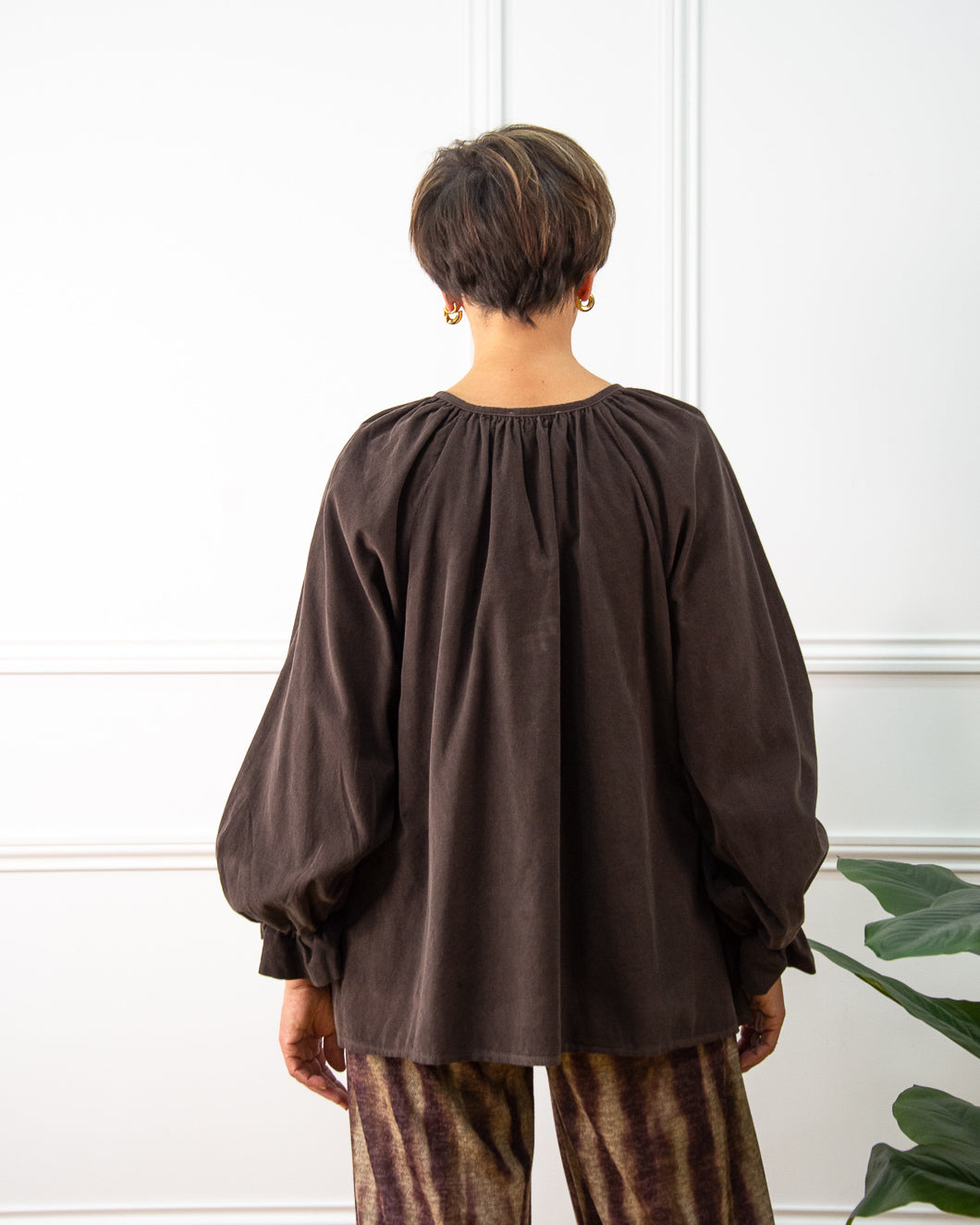 Blusa de micropana, el escote se cierra con una tira para anudar, la manga es abullonada y termina en volante con goma y lazo. Ideal si quieres ir calentita sin necesidad de llevar un jersey.