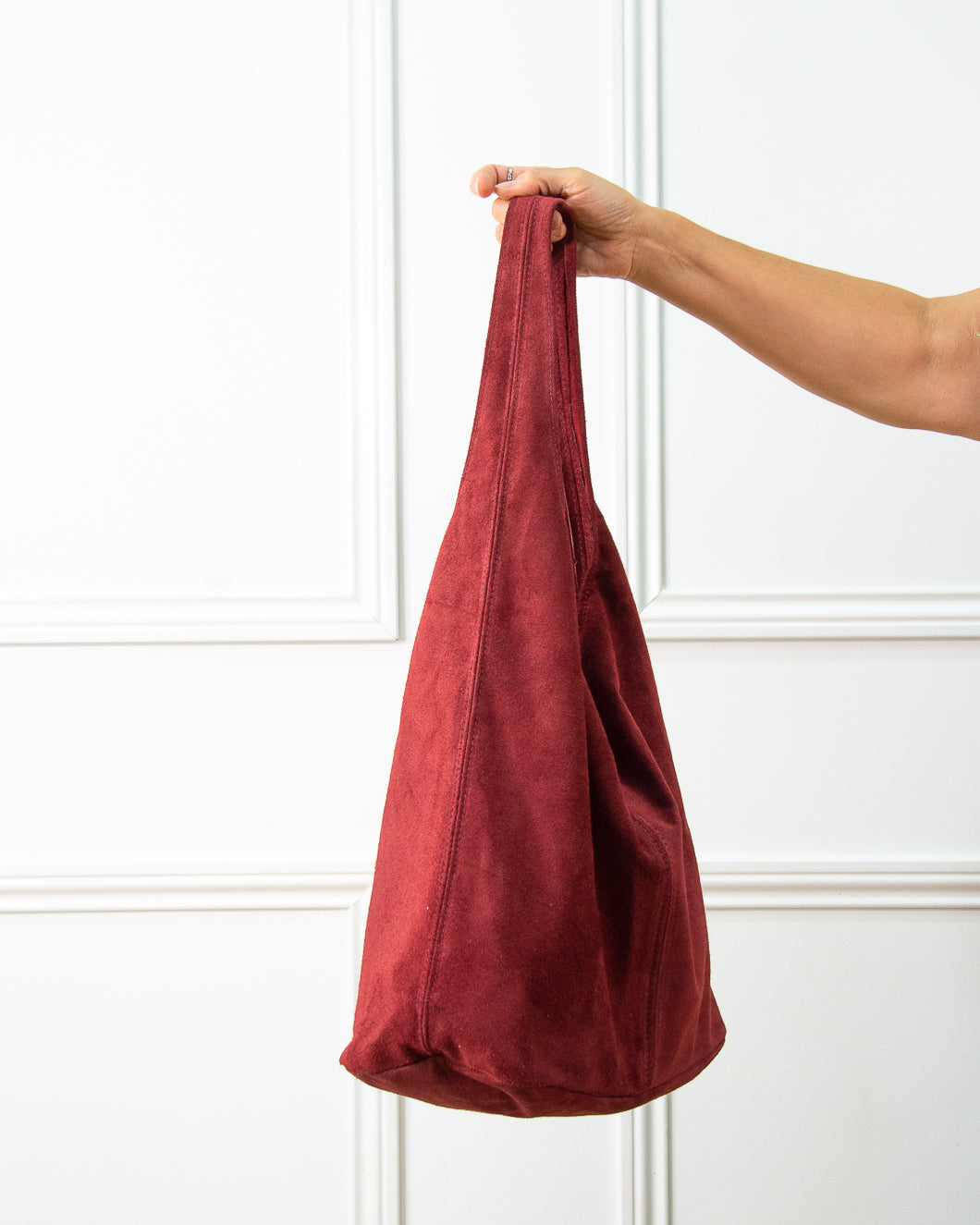 Bolso góndola de ante, no lleva forro interior, se cierra con cremallera y lleva un bolsito interior con cremallera para guardar llaves, etc.