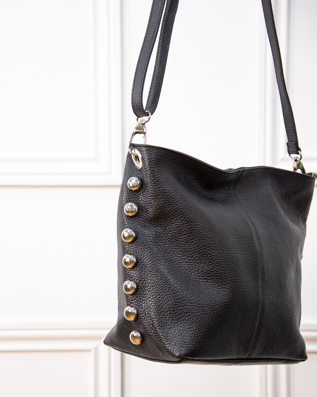 Bolso de piel, se cierra con cremallera, lleva separador con cremallera en el interior, tiene mucha capacidad, asa larga regulabre, tachas en color niquel en los laterales.
