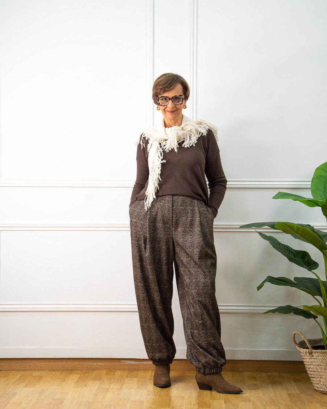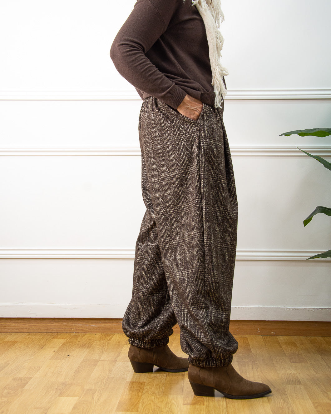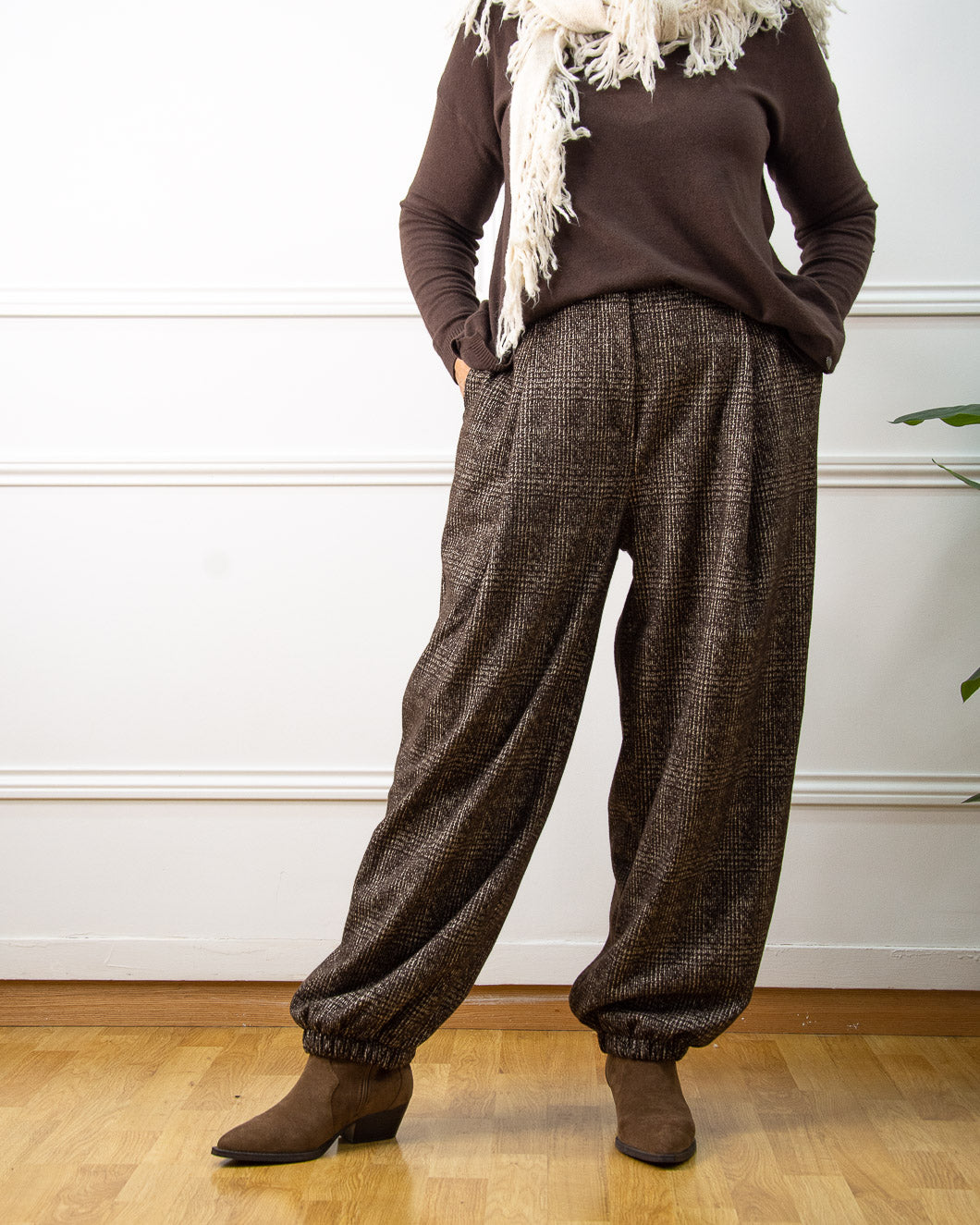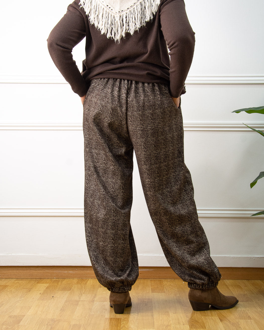 Pantalón bombacho over size, lleva goma en la cintura por la parte de la espalda para no crear volumen en el abdomen, bolsillos laterales y goma en el tobillo, el tacto es ultrasuave, combina genial con jersey liso en la parte superior del look.