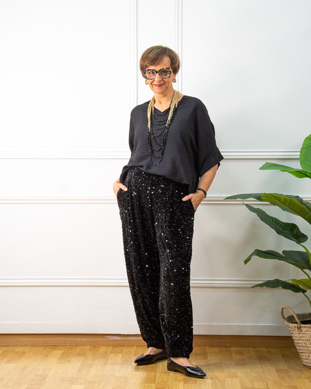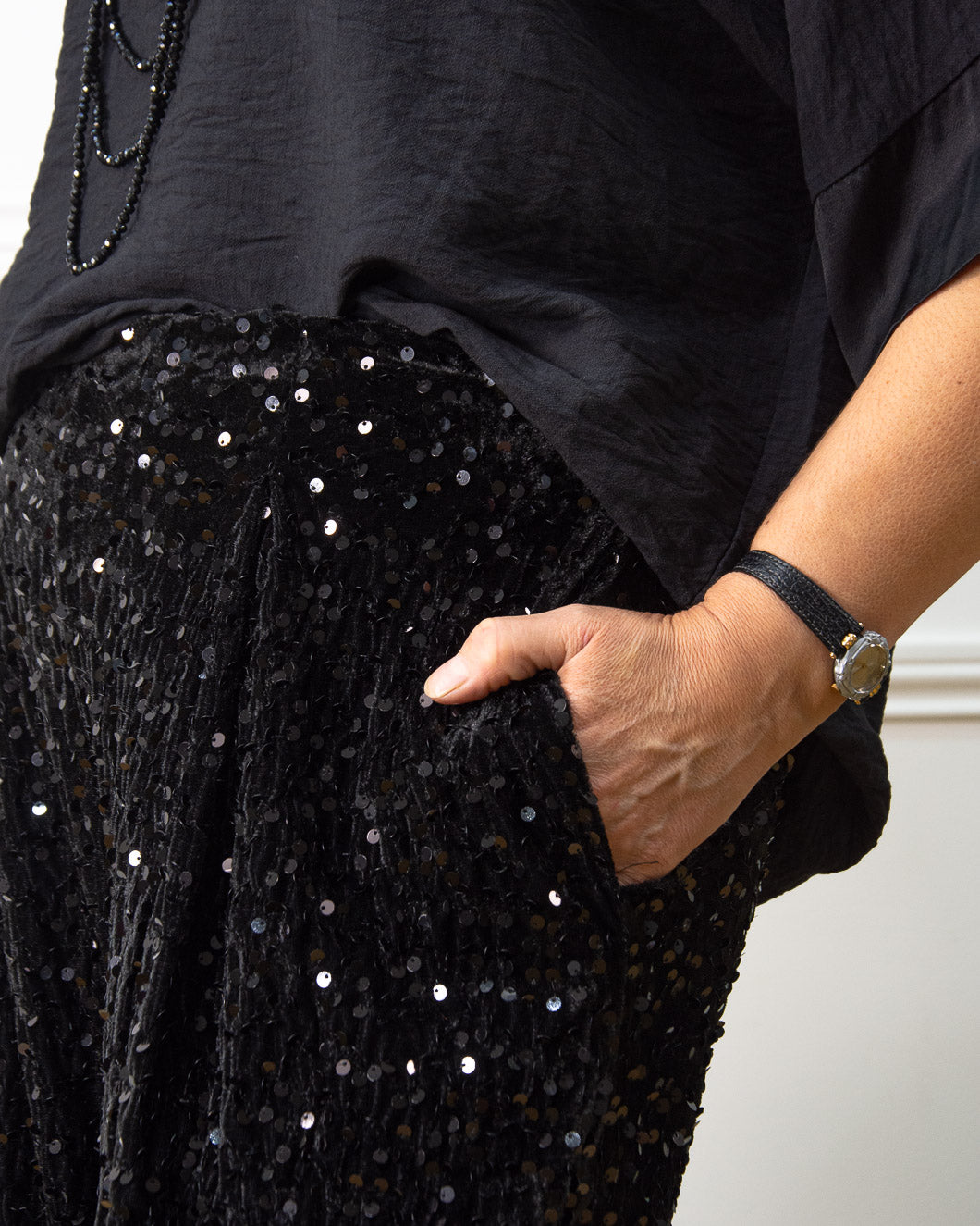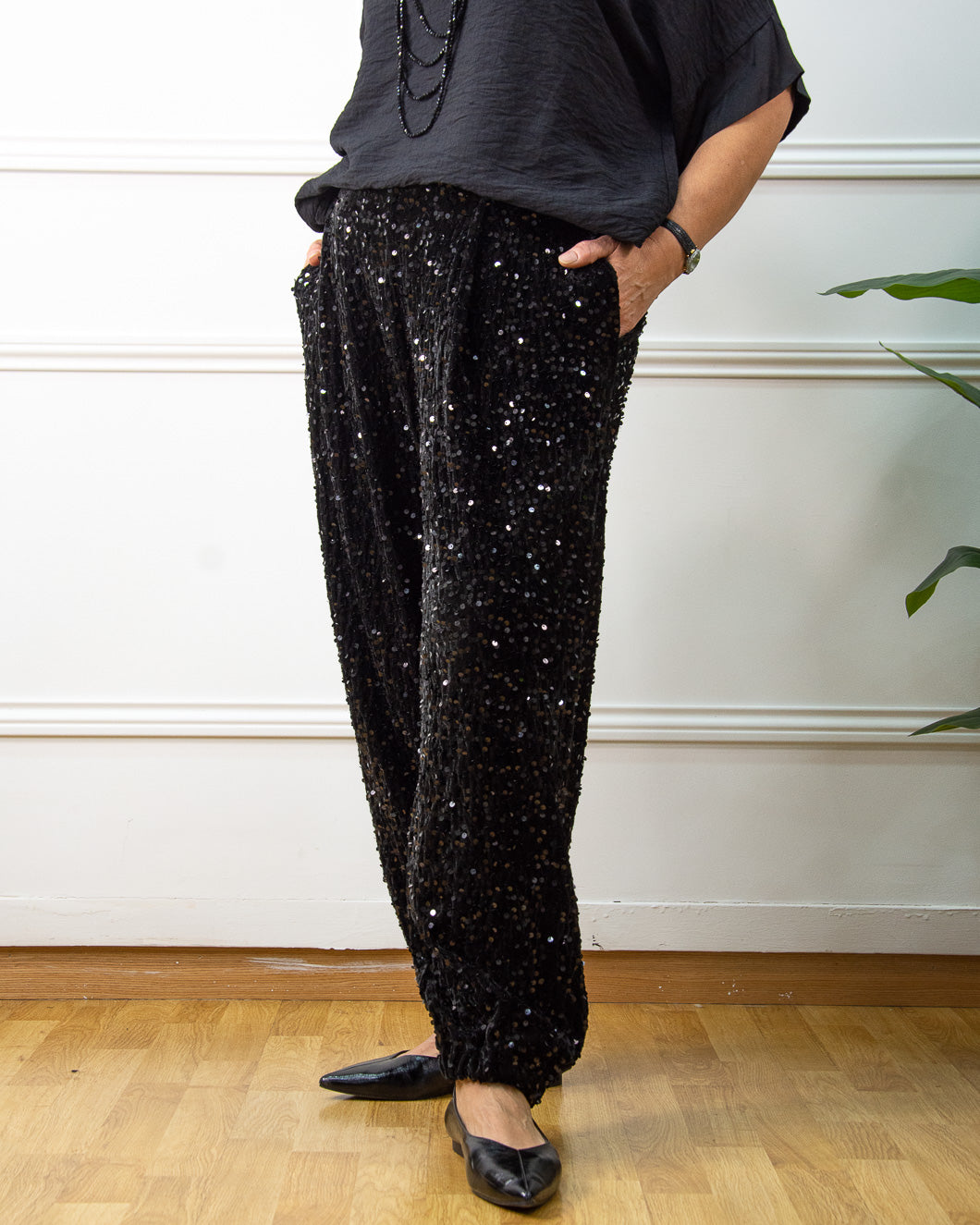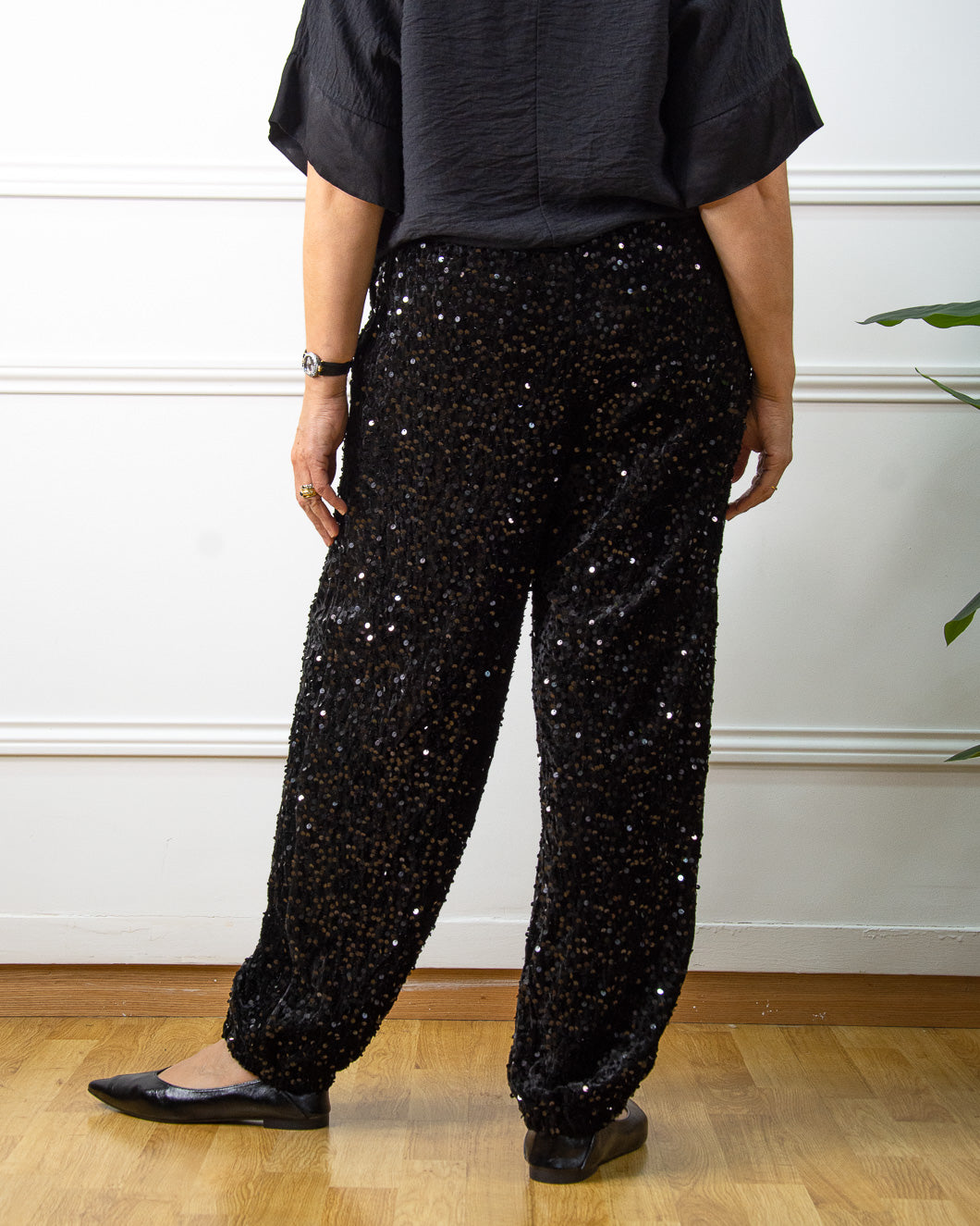 Pantalón bombacho de terciopelo con lentejuelas, lleva bolsillos laterales y forro de algodón interior, muy suave al tacto.