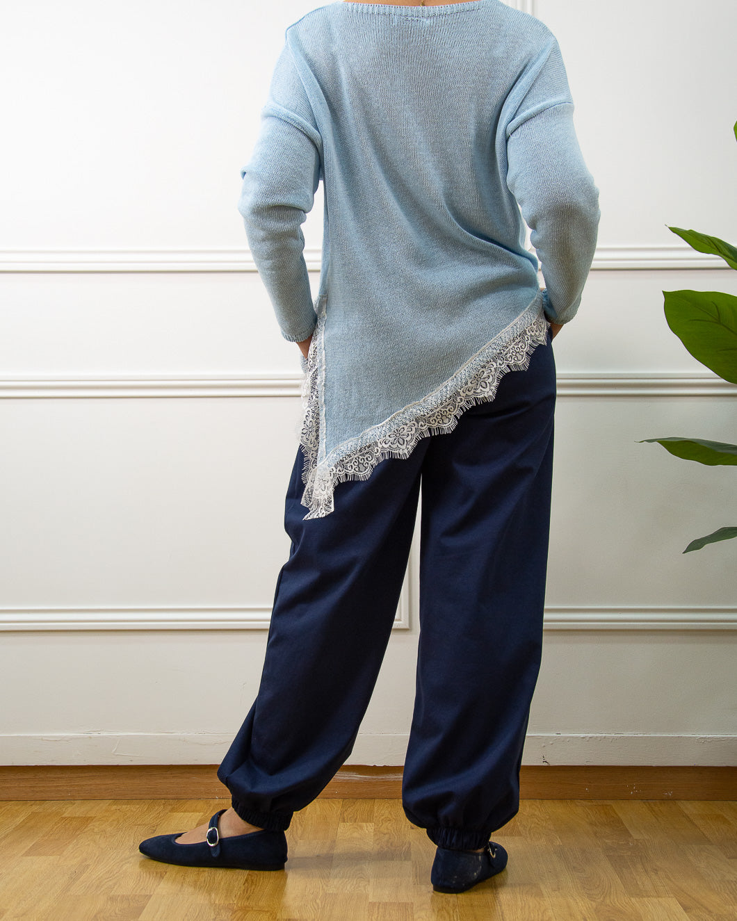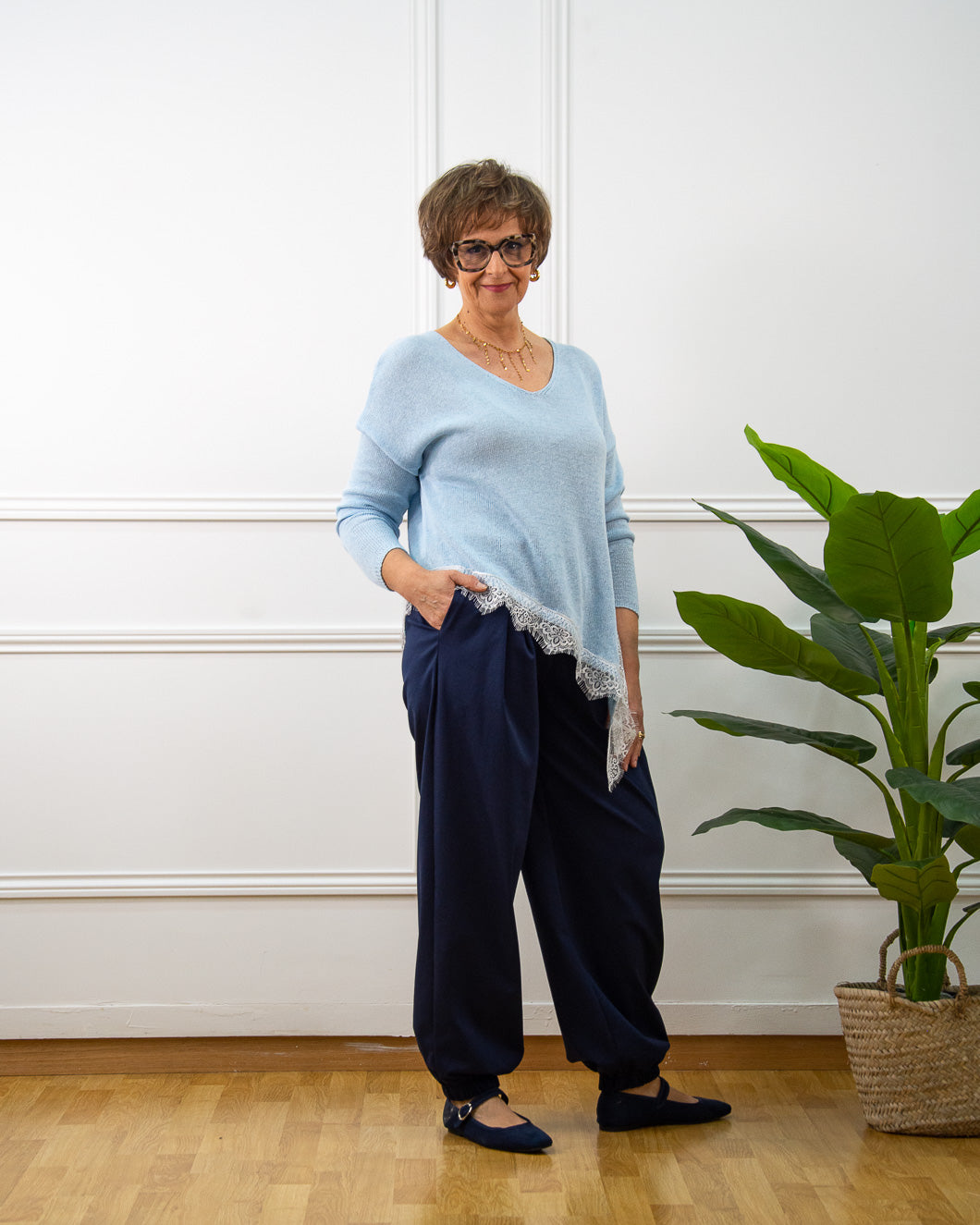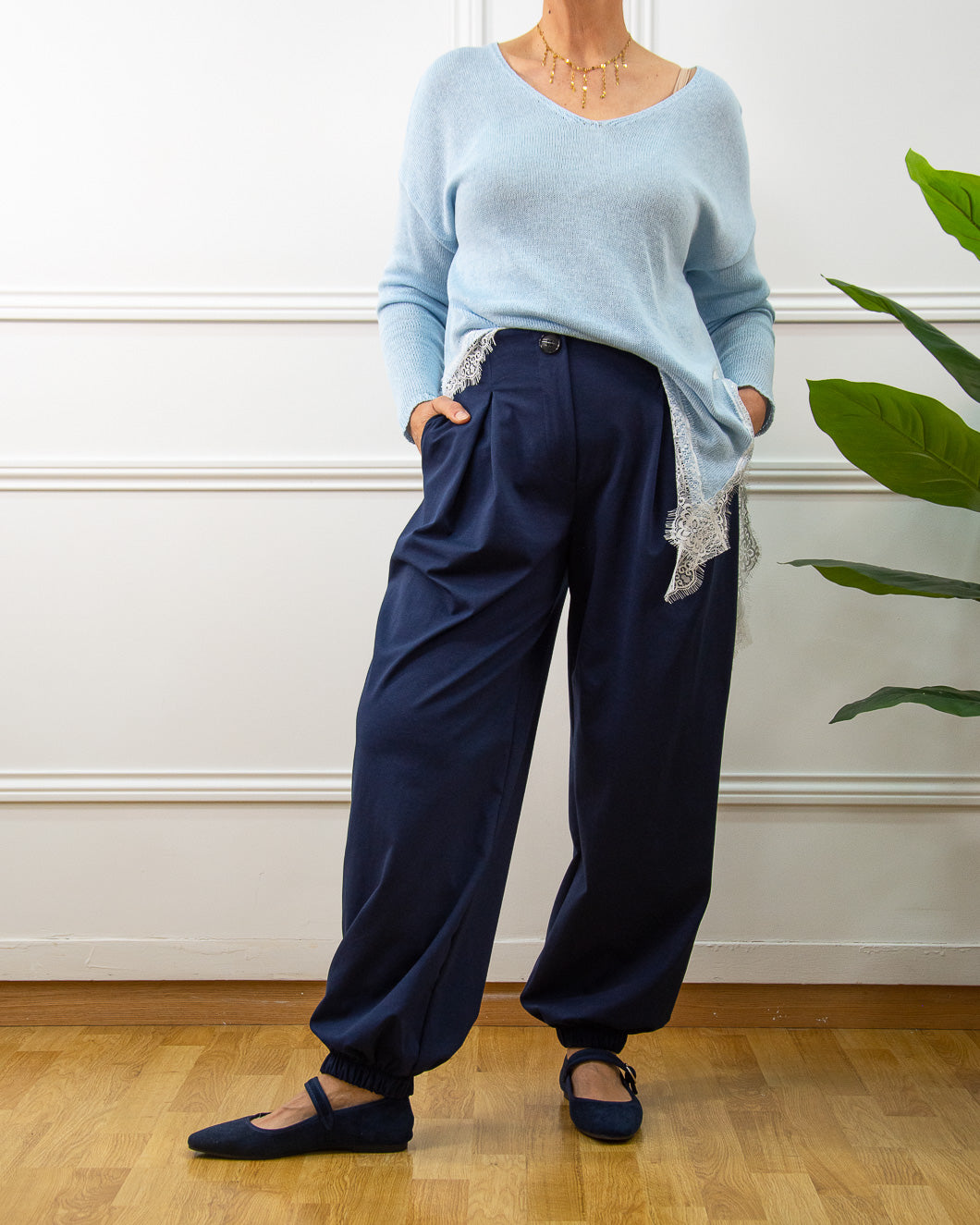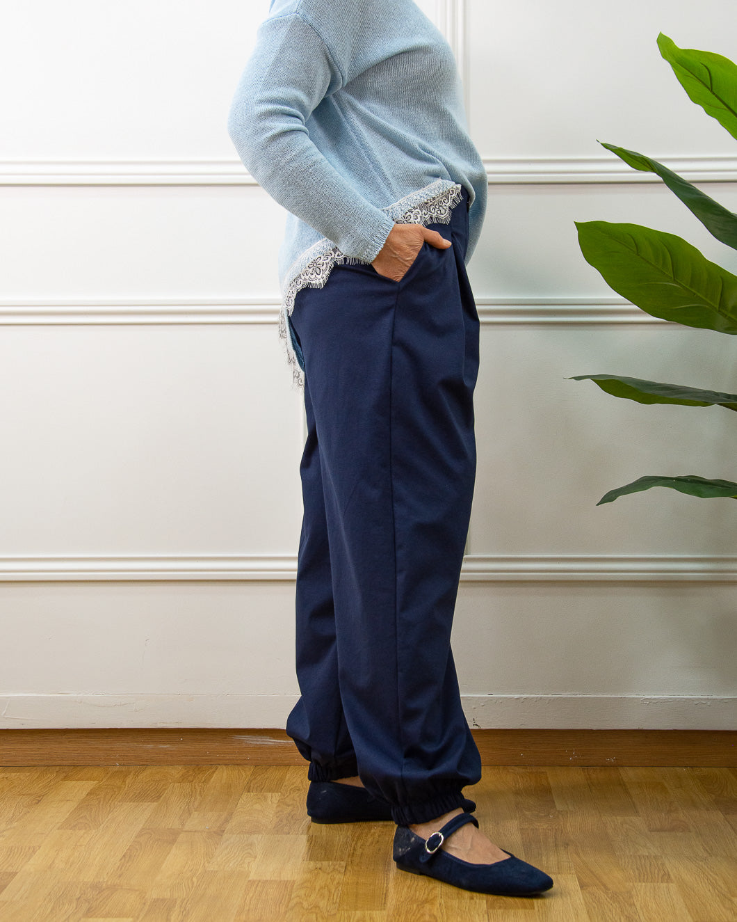 Pantalón bombacho, el tejido es ultra suave, apenas se arruga, lleva goma en la parte trasera de la cintura para que la parte delantera quede limpia, pinzas delanteras encontradas, bolsillos laterales y goma en los tobillos.