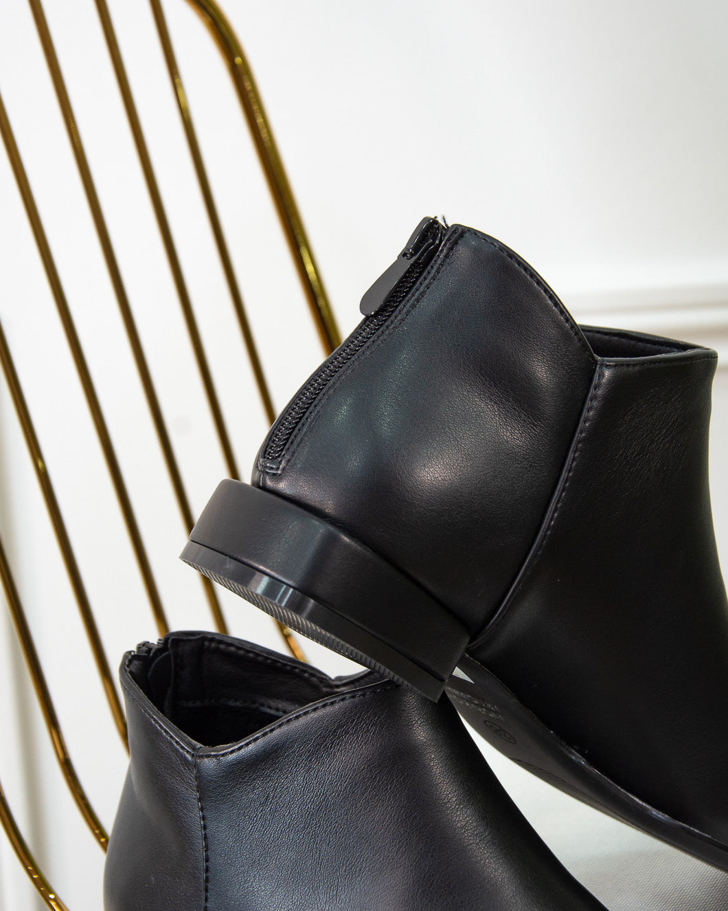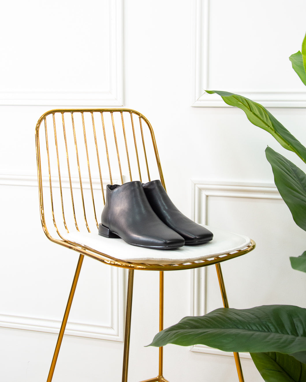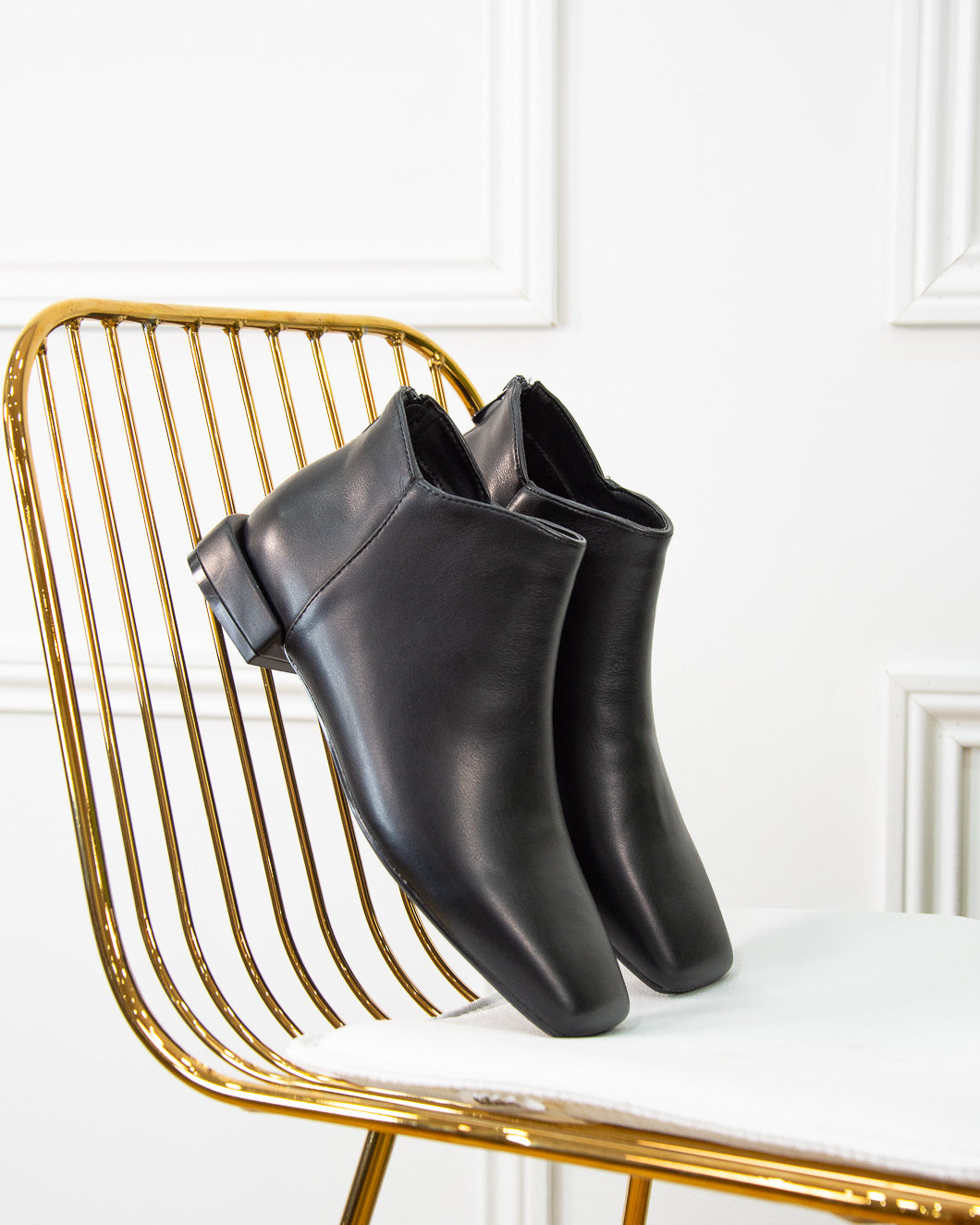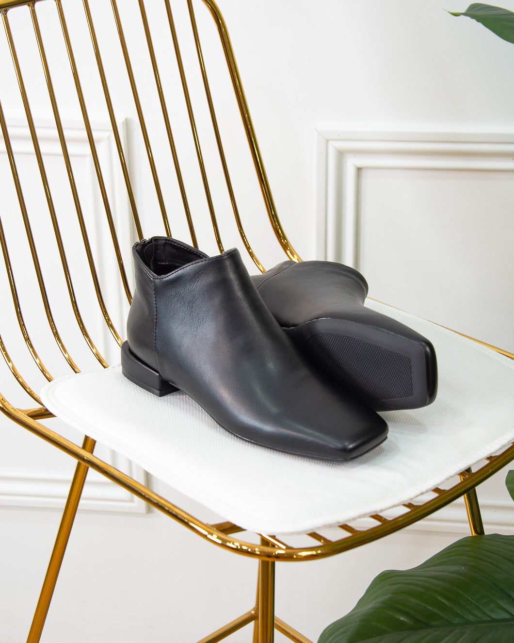 Botín bajo, puntera cuadrada, se abrocha por detrás con cremallera , ideal para completar looks de vestir con maxi faldas y pantalones palazzo.