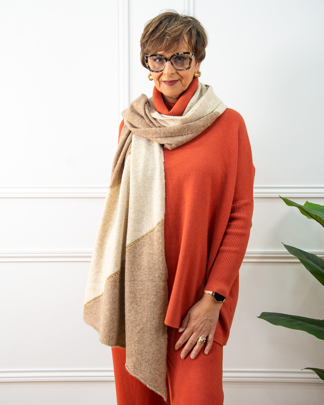 Composición: 55%viscosa, 35% cashmire, 10% lala. Color único beige. Medidas: 50x100cm.
