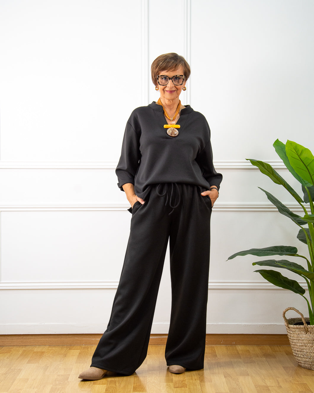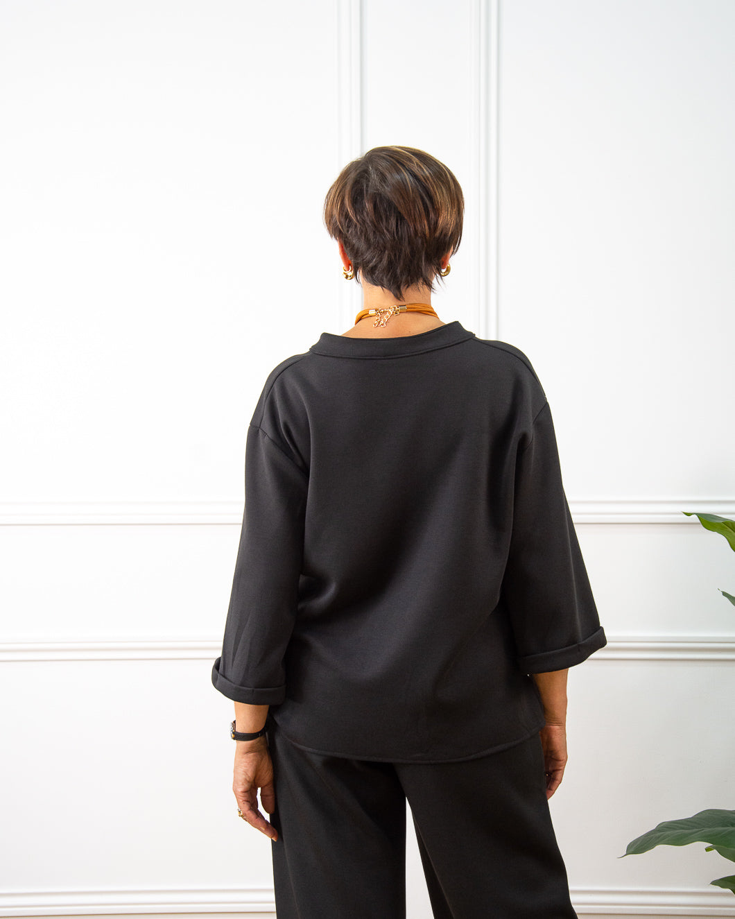 Camiseta tipo sudadera, lleva el cuello de tira, escote a pico y manga francesa con mini puño vuelto, aberturas laterales en la cadera, ideal para llevar a juego con el pantalón Chandall si buscamos un look cómodo.