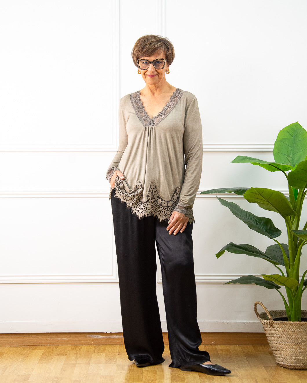 Camiseta de punto muy fino, lleva el escote, puños y bajo con blonda, ideal como prenda básica para combinar con chaquetas. Lleva pliegues en la parte del pecho para no marcar abdomen.