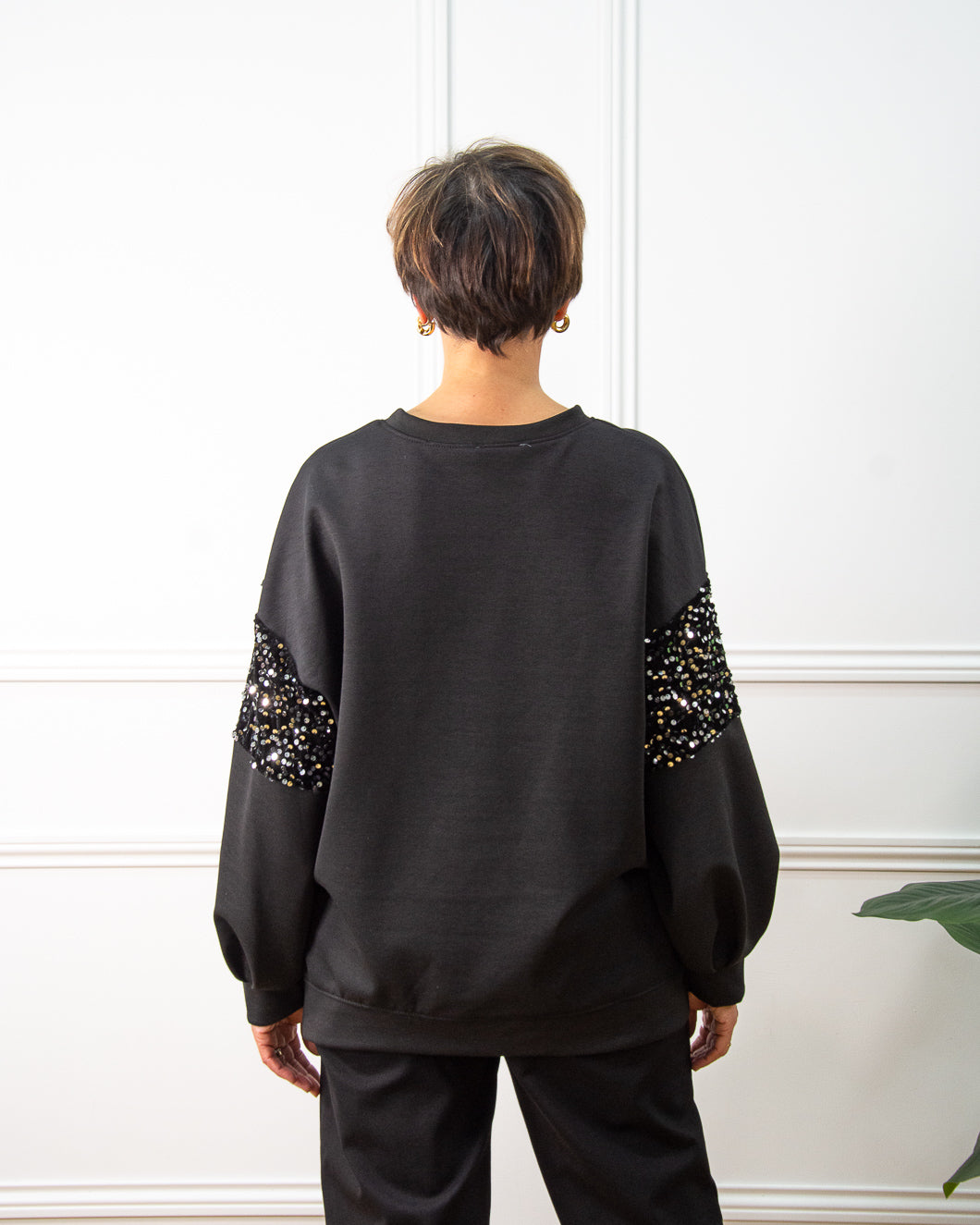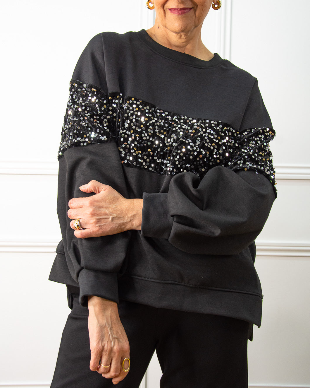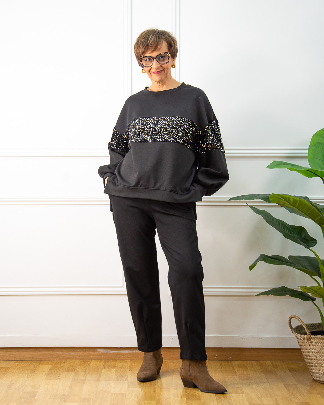 Camiseta de neopreno con franja de lentejuelas frontal y en la manga. Tiene aberturas laterales para que no marque la cadera, cuello a la caja, combina muy bien con pantalón terciopelo o bombacho de cuadros marrones.