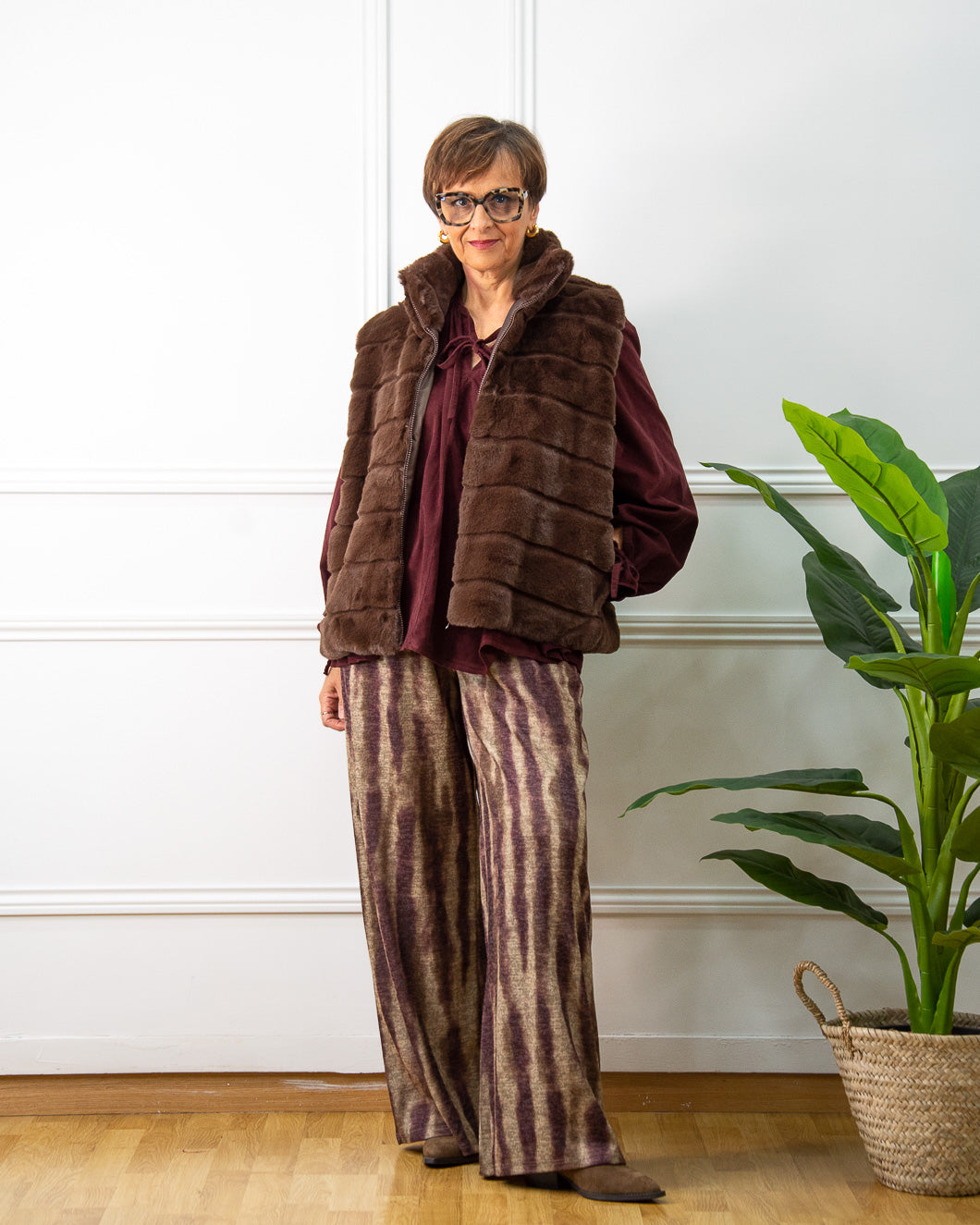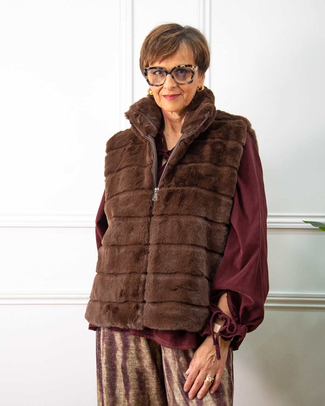 Chaleco de pelo ecológico, lleva forro interior, cremallera y bolsillos laterales, el cuello es de tira. Ideal para poner con faldas largas estampadas y vestidos.