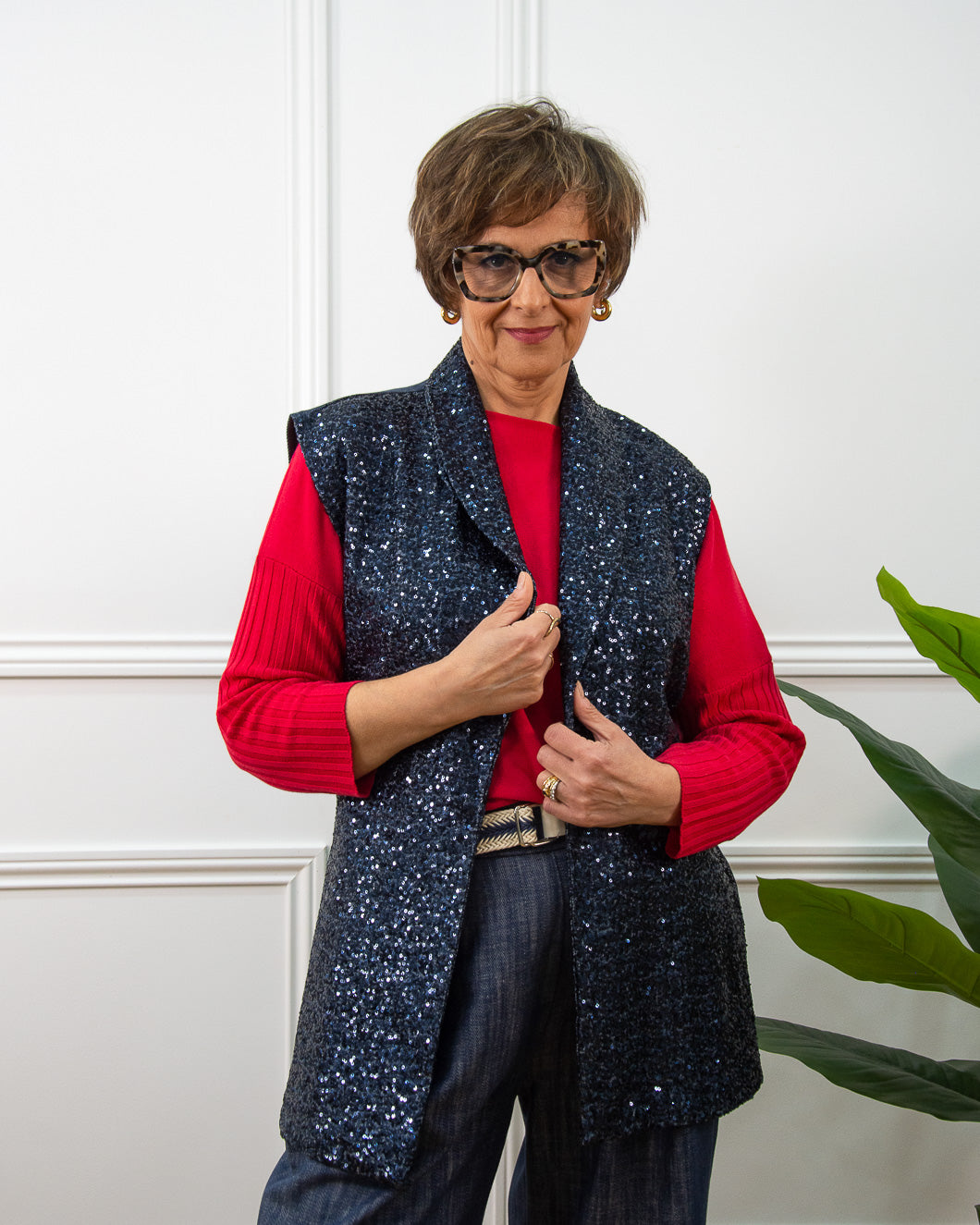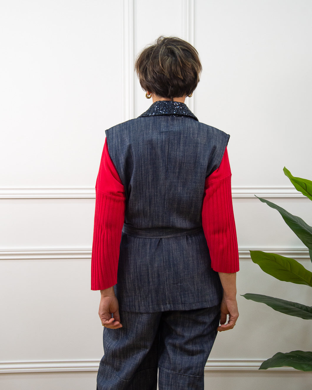 Chaleco denim oscuro, lleva toda la parte delantera bordada con paillets al tono, lo que hace tener un contraste muy original con el denim. Lleva cinturón al tono para llevar la prenda más ajustada. Ideal para combinar con el pantalón Elisa y conseguir un total look.
