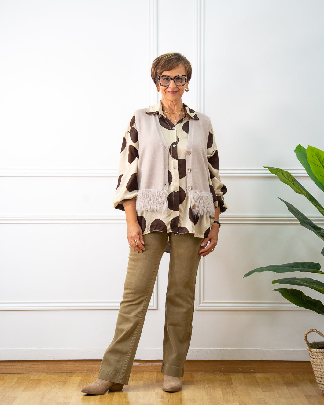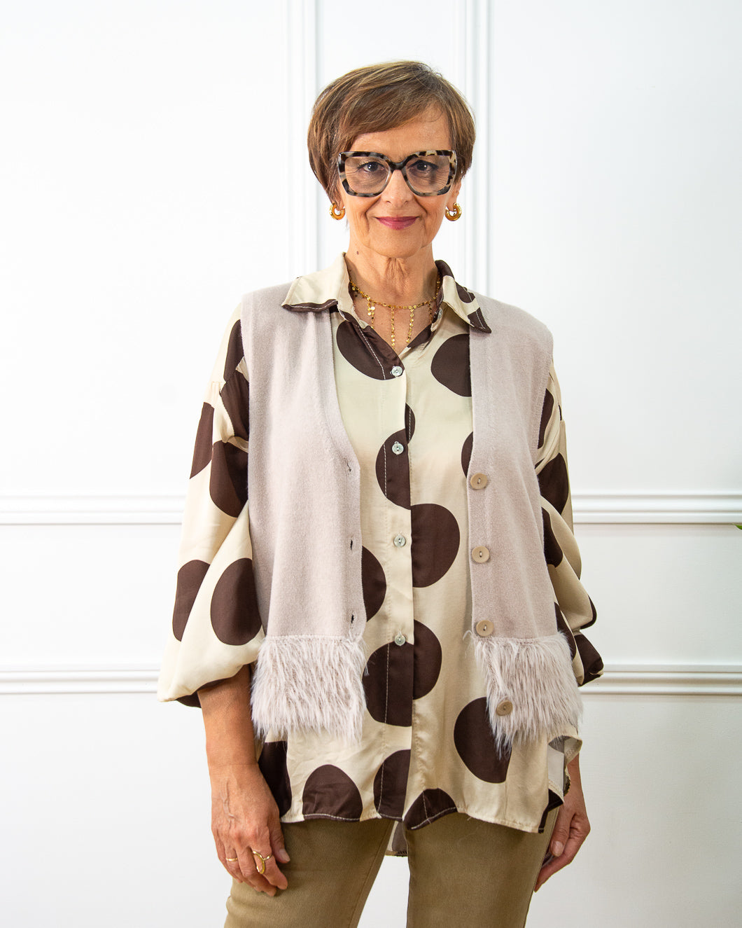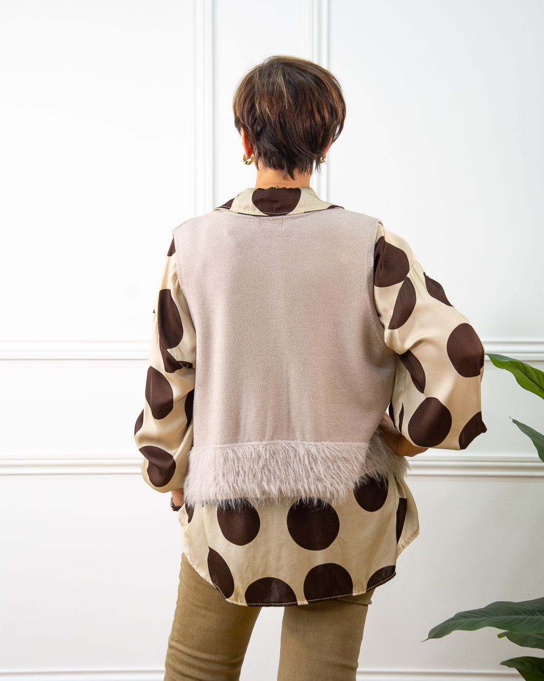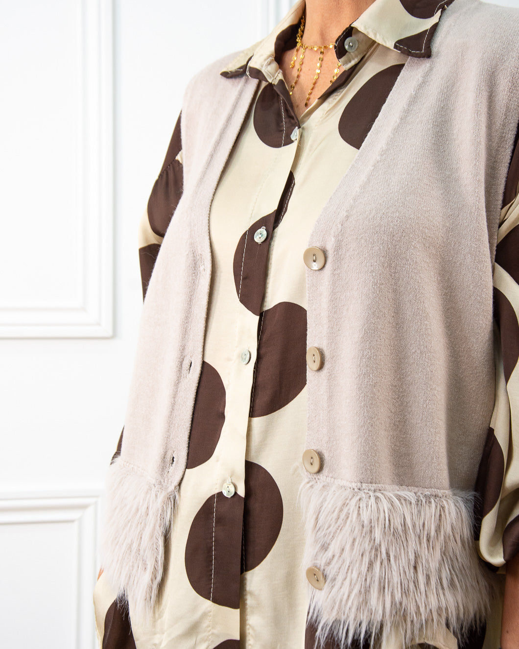 Chaleco de punto abotonado en la parte delantera, el tacto es súper suave, lleva un adorno de pelo de 10cm en la parte de abajo. Ideal para llevar con vestidos y faldas largas o con camisa y vaqueros.