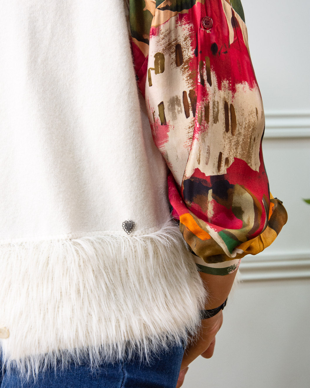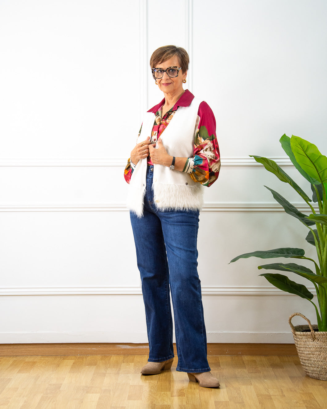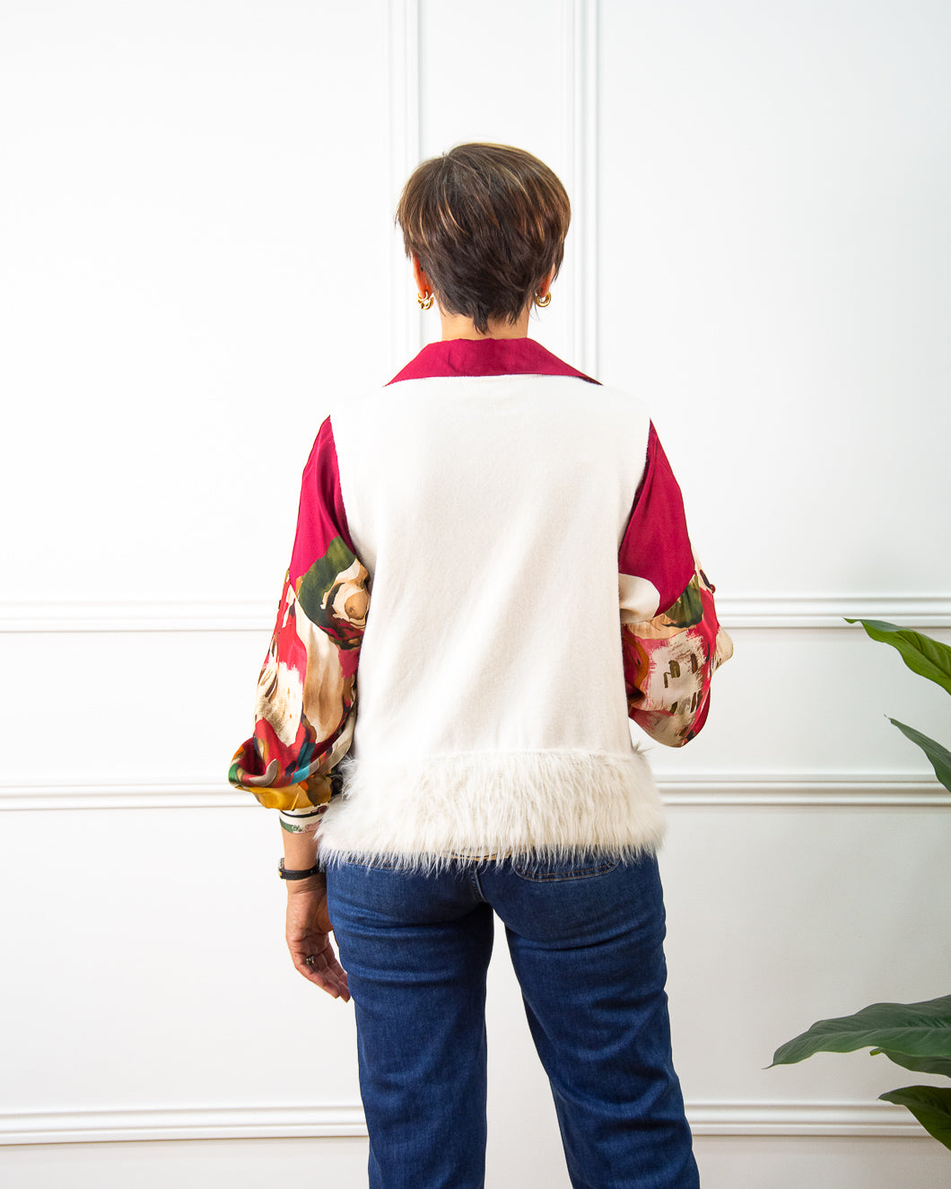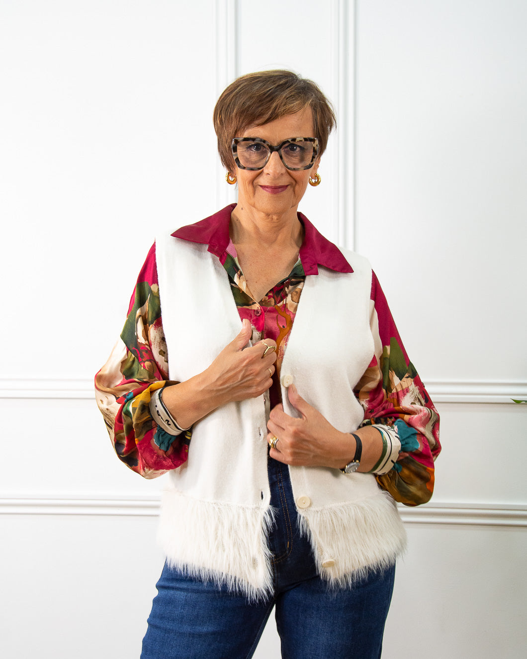 Chaleco de punto abotonado en la parte delantera, el tacto es súper suave, lleva un adorno de pelo de 10cm en la parte de abajo. Ideal para llevar con vestidos y faldas largas o con camisa y vaqueros.