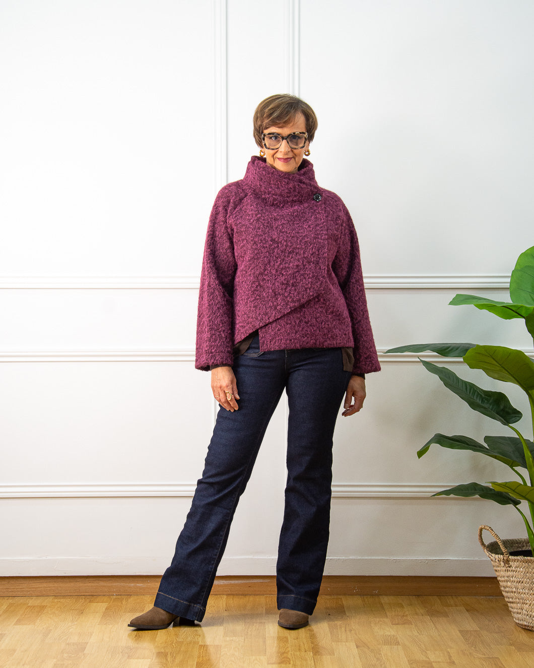 Chaqueta corta asimétrica con cuello chimenea y cierre de botón cruzado. Elegante, perfecta para el día a día y ocasiones más especiales.