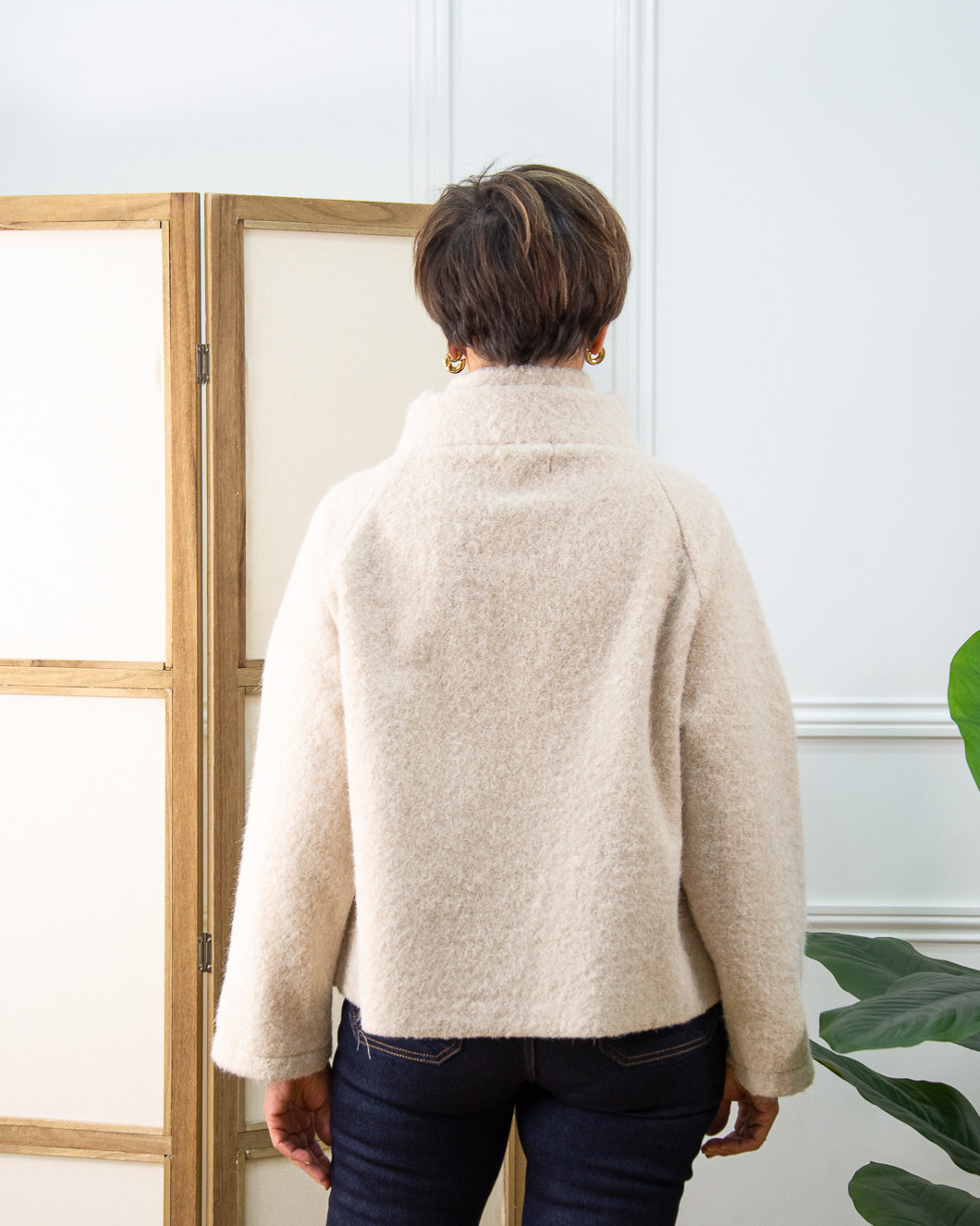 Chaqueta corta asimétrica con cuello chimenea y cierre de botón cruzado. Elegante, perfecta para el día a día y ocasiones más especiales.