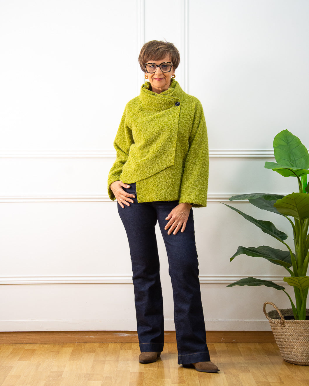 Chaqueta corta asimétrica con cuello chimenea y cierre de botón cruzado. Elegante, perfecta para el día a día y ocasiones más especiales.