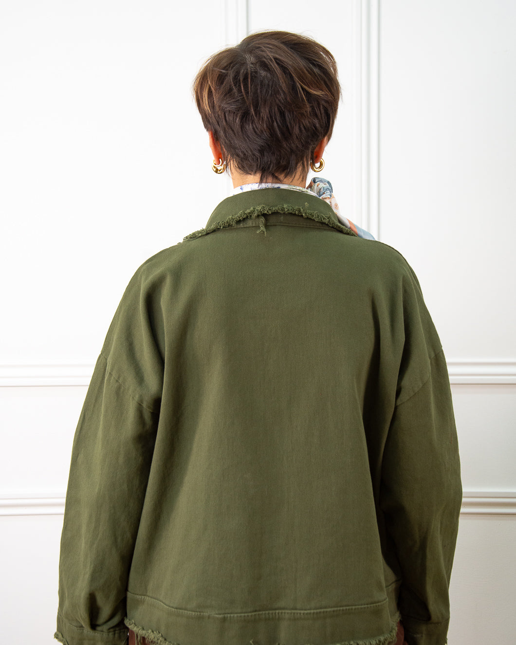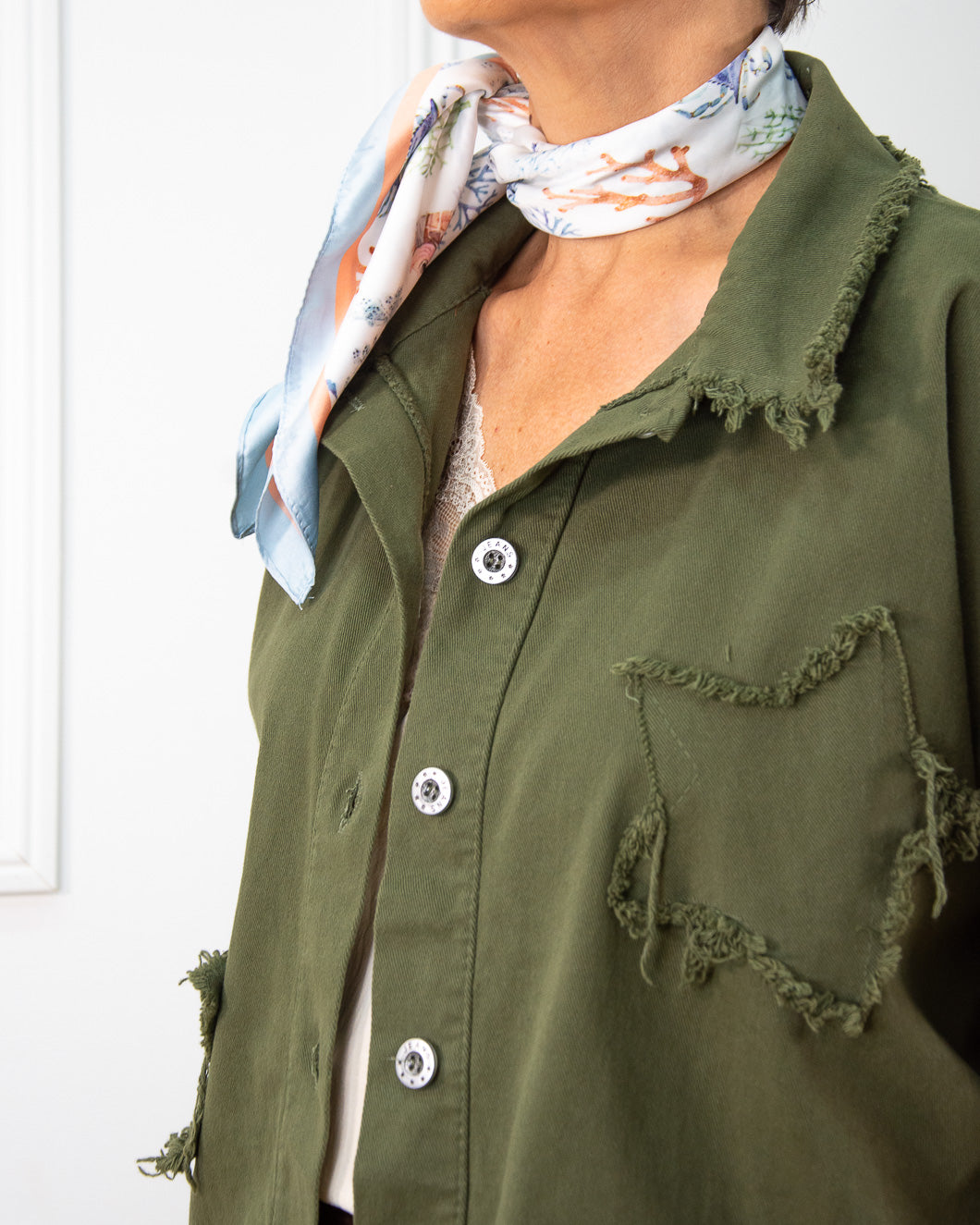 Cazadora tipo vaquero de loneta, lleva dos estrellas cosidas en los delanteros, no tiene bolsillos, queda ideal encima de vestidos estampados como prenda de entretiempo.