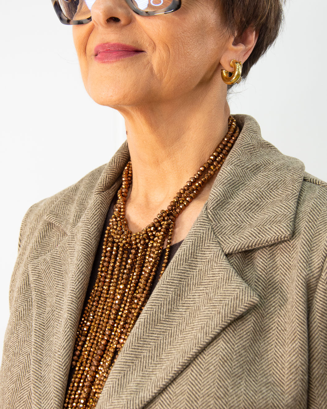 Blazer de franela con estampado espiguilla, no lleva forro ni bolsillos, aunque sí tapetas, lleva un botón delantero para abrochar. A juego el pantalón y la falda para hacer un total look.