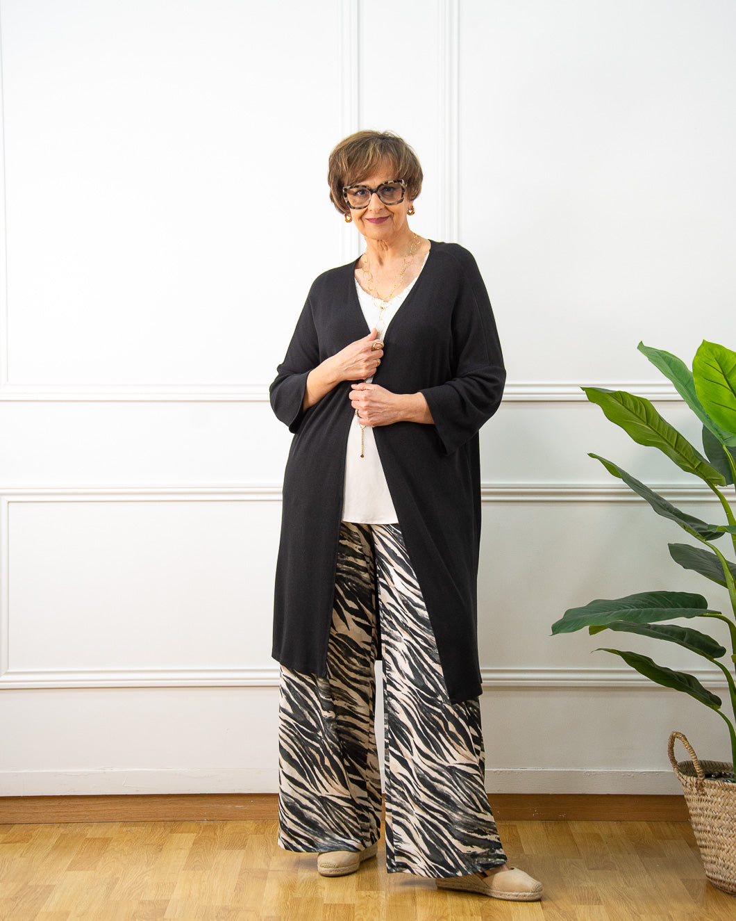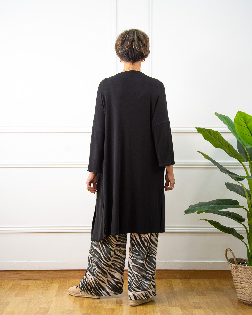 Chaqueta maxi de verano de punto muy fino, es muy básica para combinar tanto con vestidos largos como con pantalones fluidos y tops. Tiene mucha caída y movimiento, va abierta y sin bolsillos.
