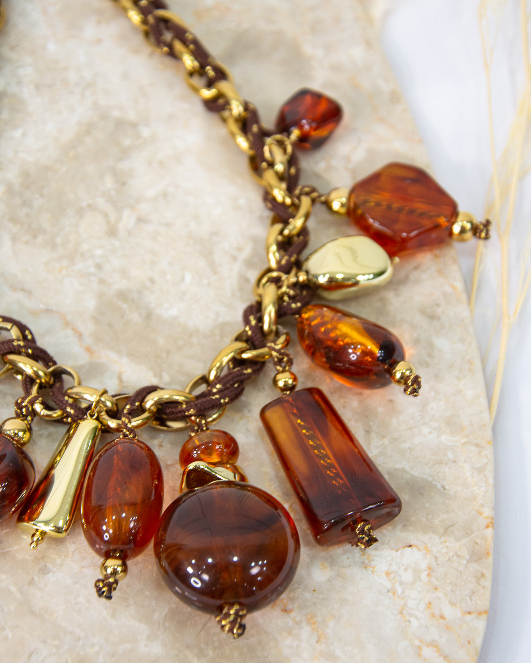 Collar corto , muy ligero, ideal para jerséis cuello caja, lleva 11 colgantes combinando dorados y marrones, súper tendencia.