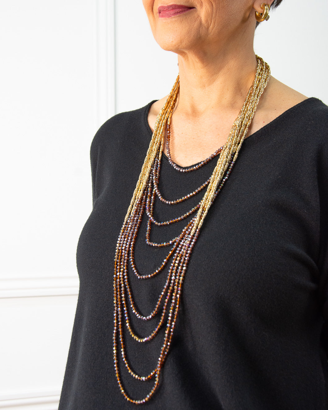 Collar múltiple, combina dos colores, la parte más corta 48cm, la parte más larga 98cm. Lleva nueve mini collares unidos , cadena alargadora de 5cm.
