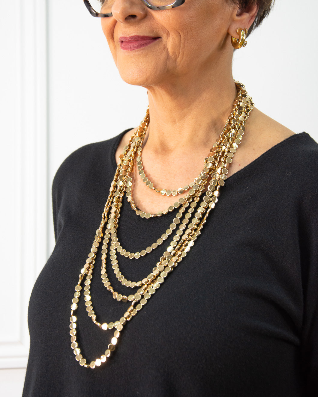 Collar múltiple , lleva siete mini collares unidos, es muy ligero, la parte más corta mide 40cm y la más larga 80cm. Al ser plano es muy cómodo.