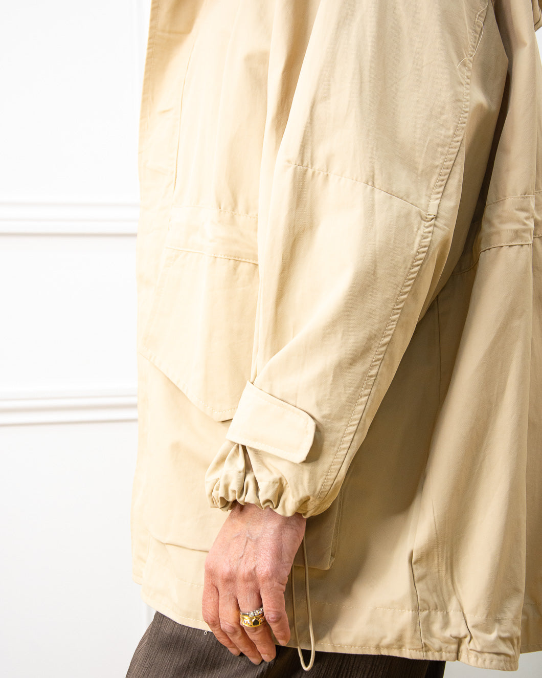 Cortavientos con capucha no desmontable, no lleva forro, dos bolsillos con solapa por la parte delantera, cremallera y velcro para abrochar, lleva goma en la cintura por si lo queremos ajustar y en el final de la manga también. La manga es muy ancha para poder poner un jersey debajo.