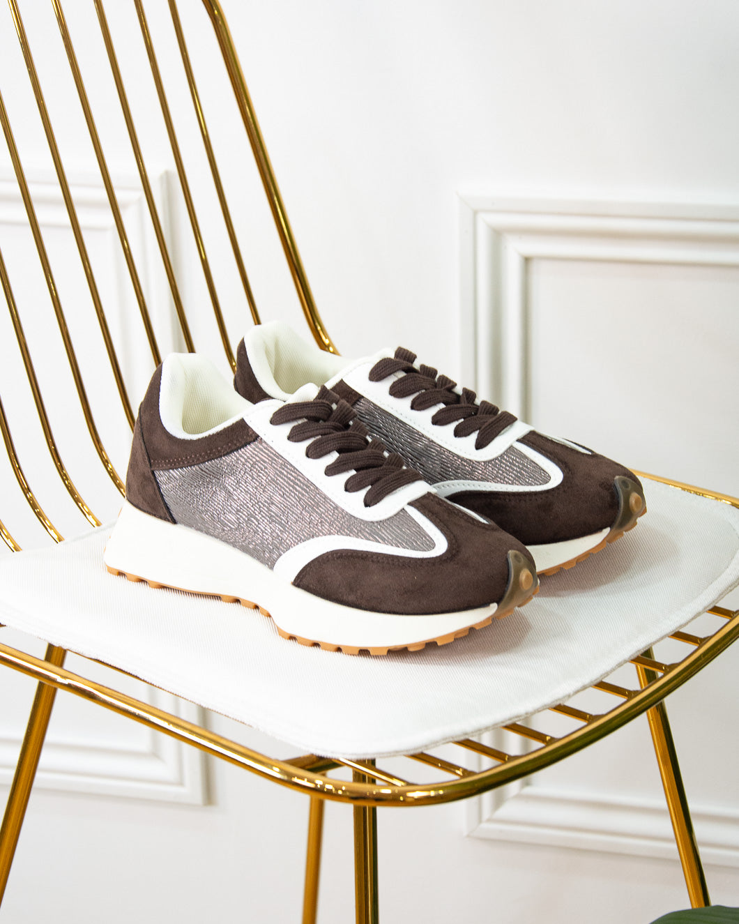 Deportiva en tendecia, es súper ligera, combina tonos marrones y blanco roto, ideal para combinar con pantalón de punto Cloe.Color único marrón. Plantilla extraíble, talla normal, recomendamos elegir el número habitual.