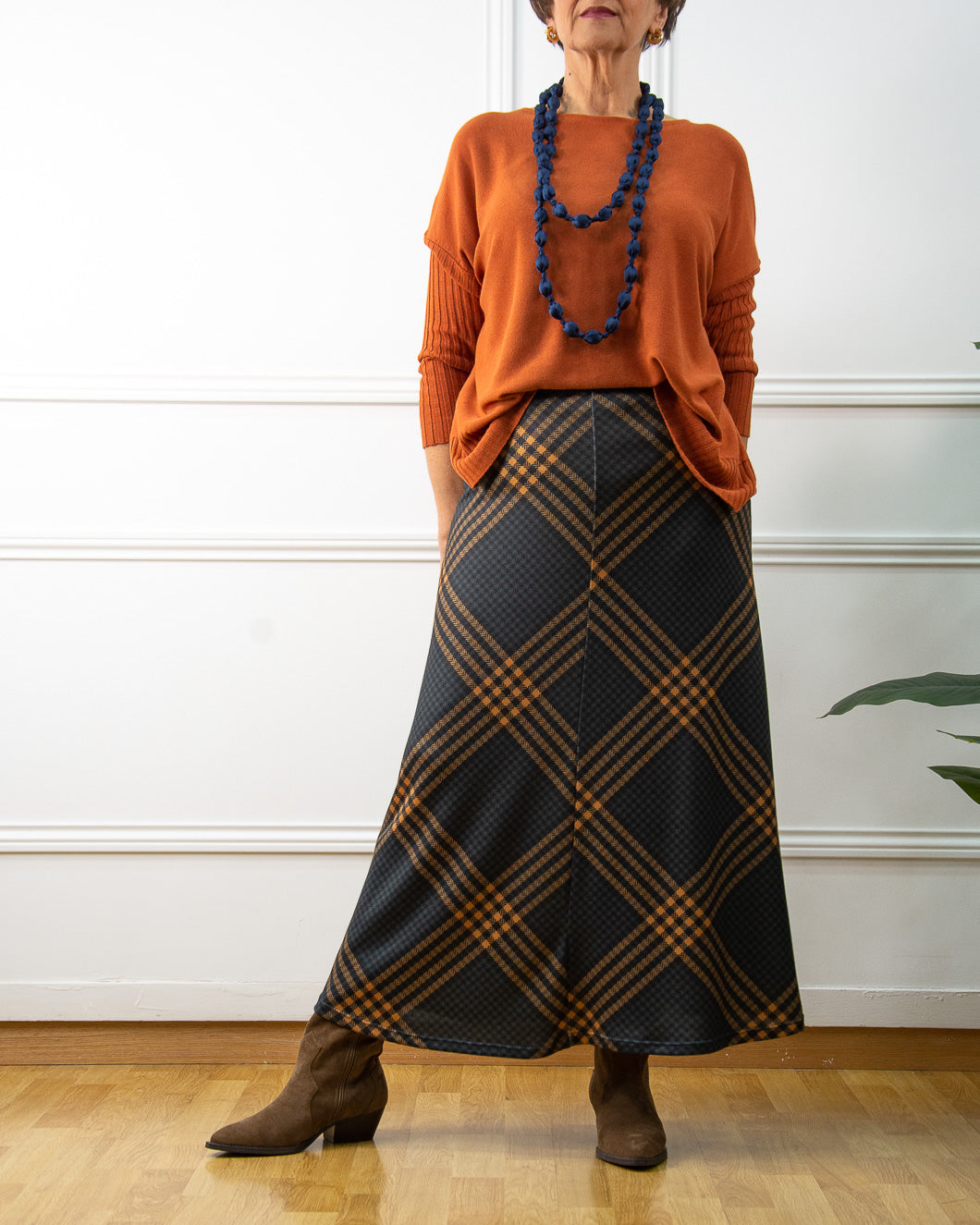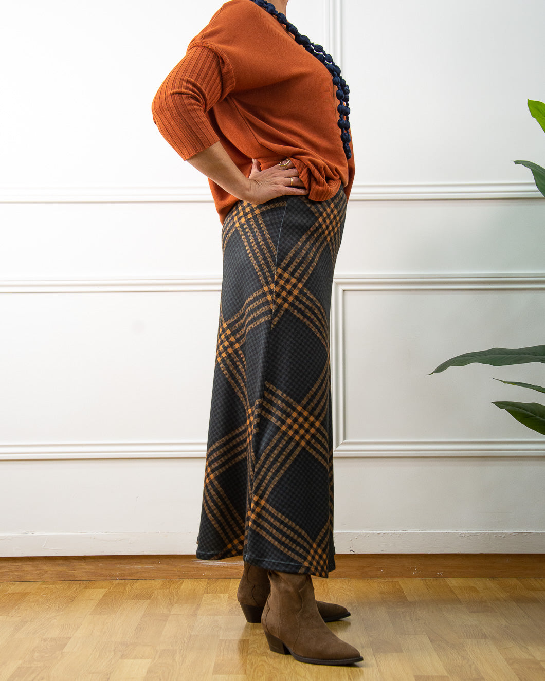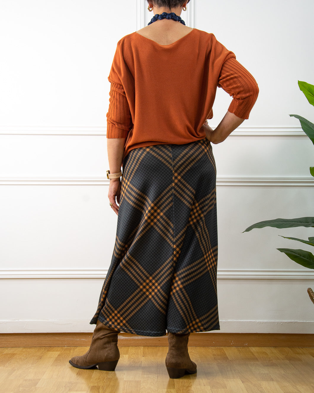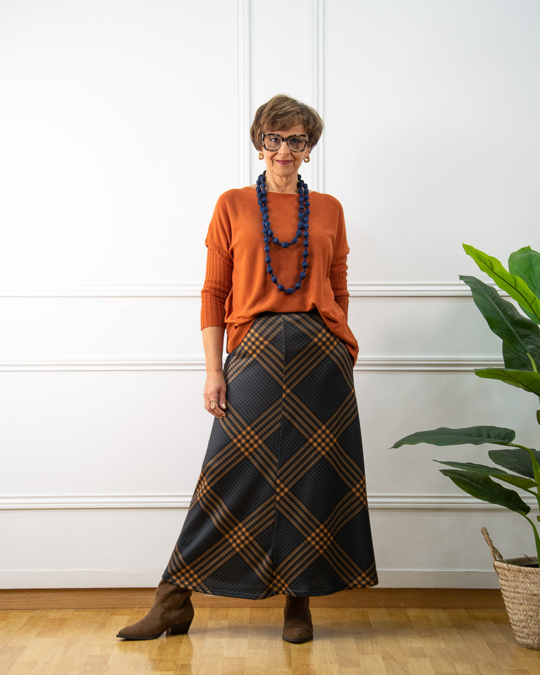 Falda de corte evasé, lleva una gomade 4cm en la cinturilla, es súper suave al tacto, no se pega y tiene muchísima caída, ideal para combinar con jersey Penny teja.