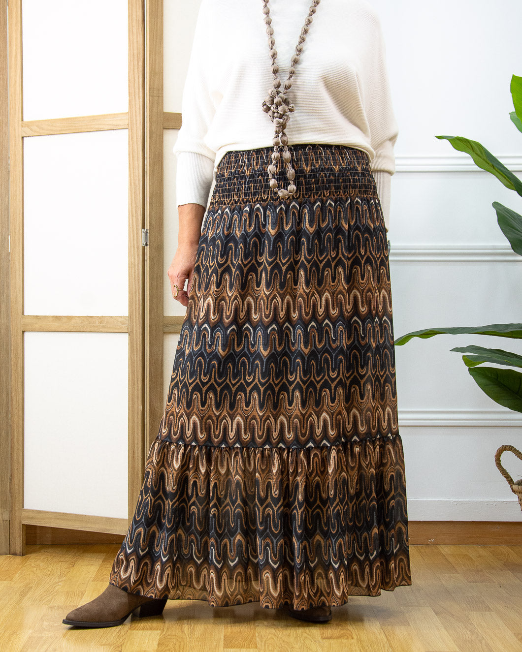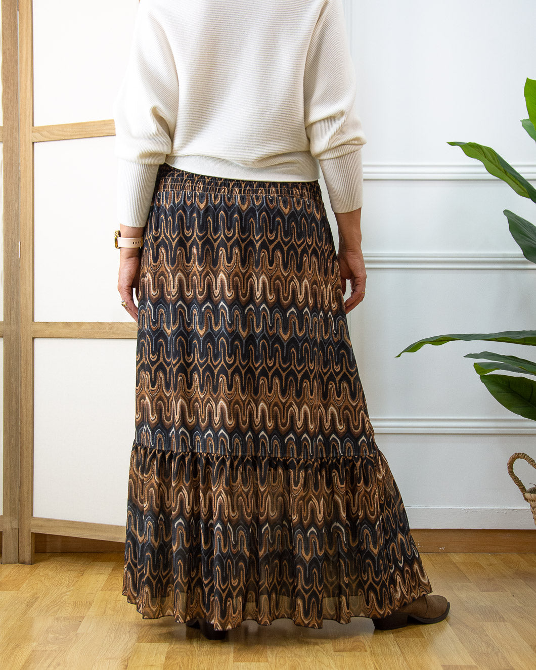 Falda de gasa con nido de abeja de 15cm de ancho en la cintura, lleva un volante ancho en el bajo, lleva forro hasta la altura de la rodilla, no necesita plancha. Combinar con jersey Alina.