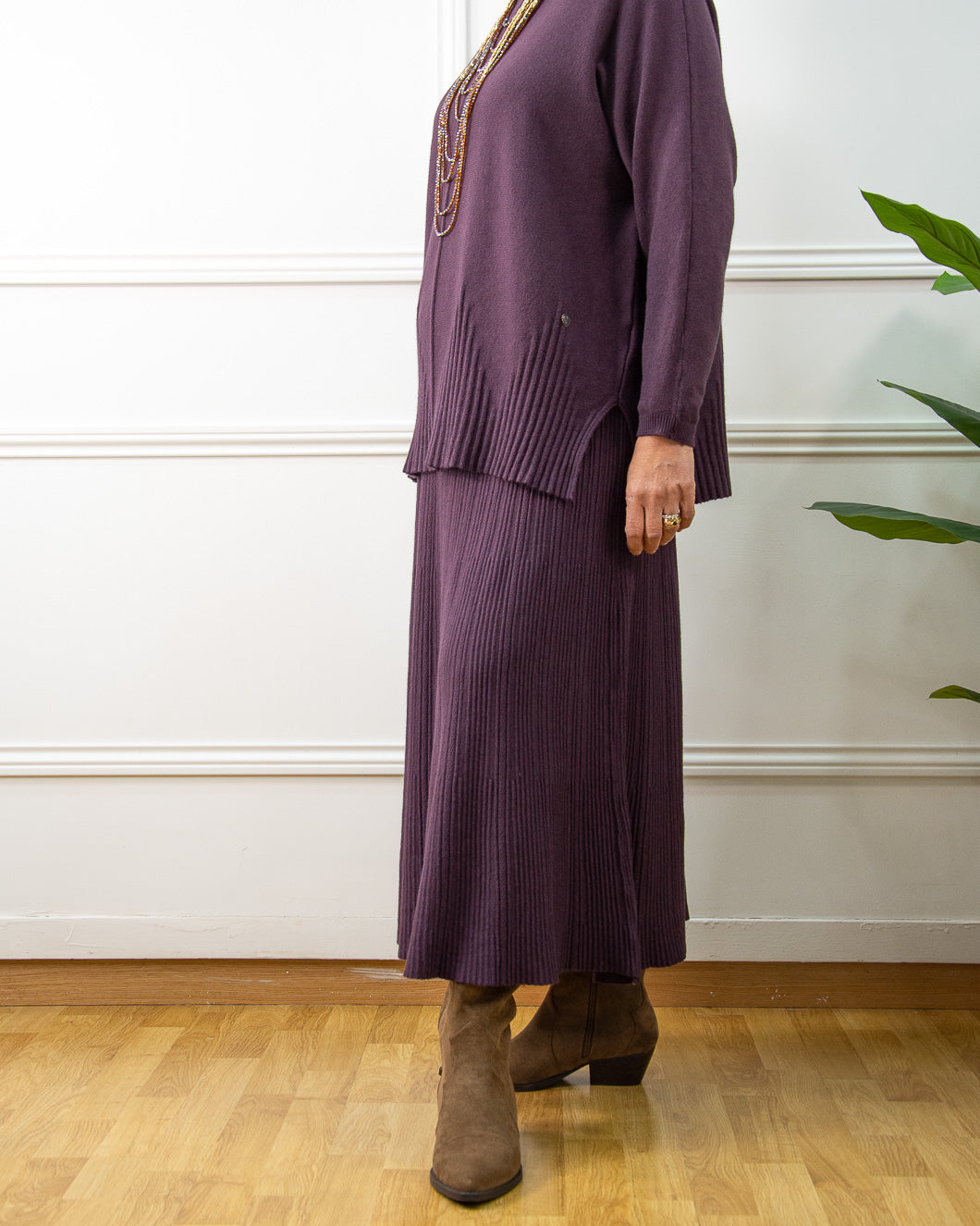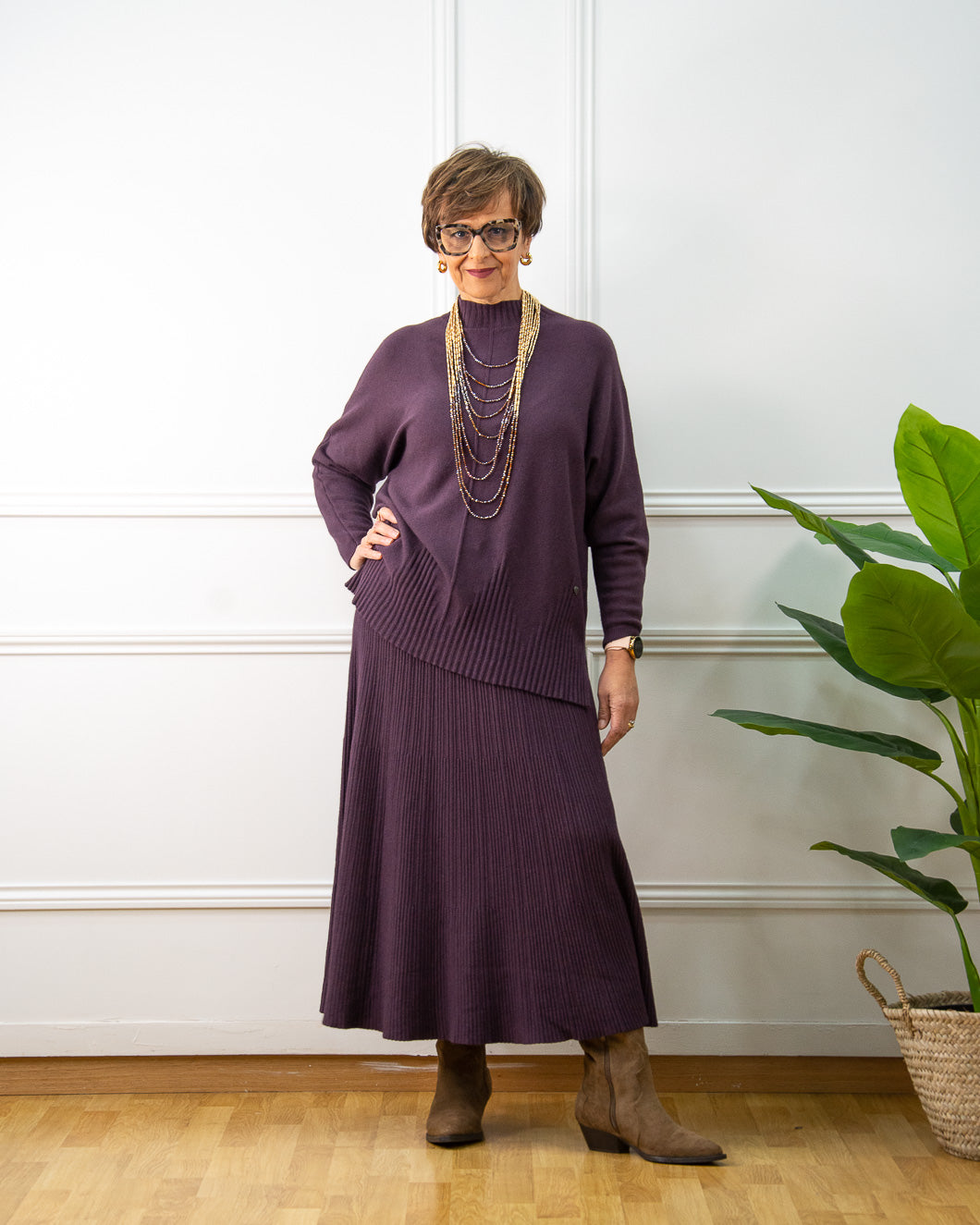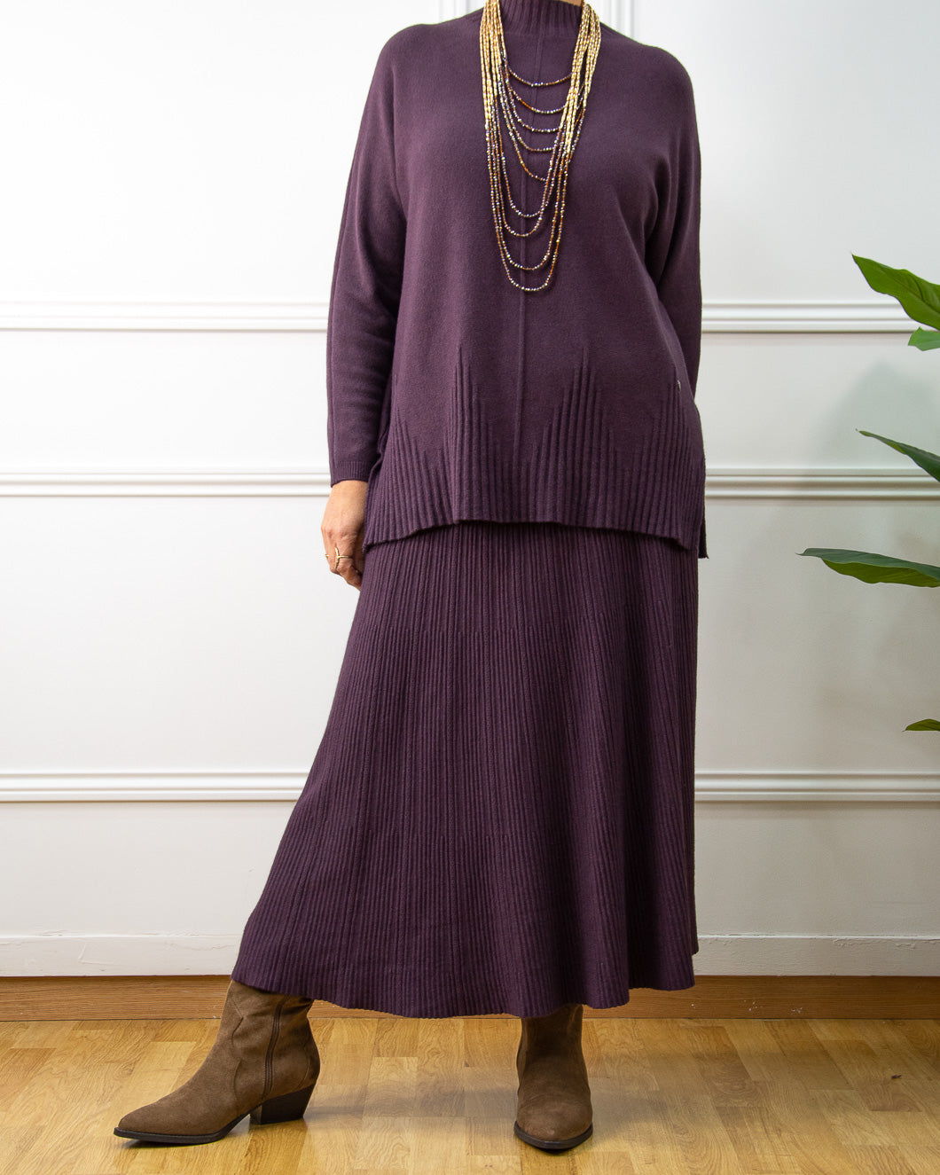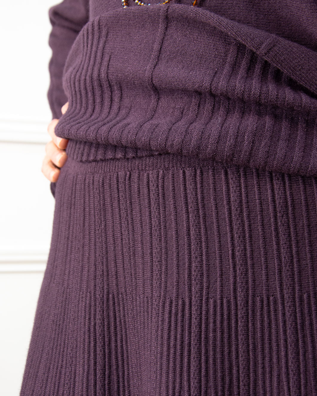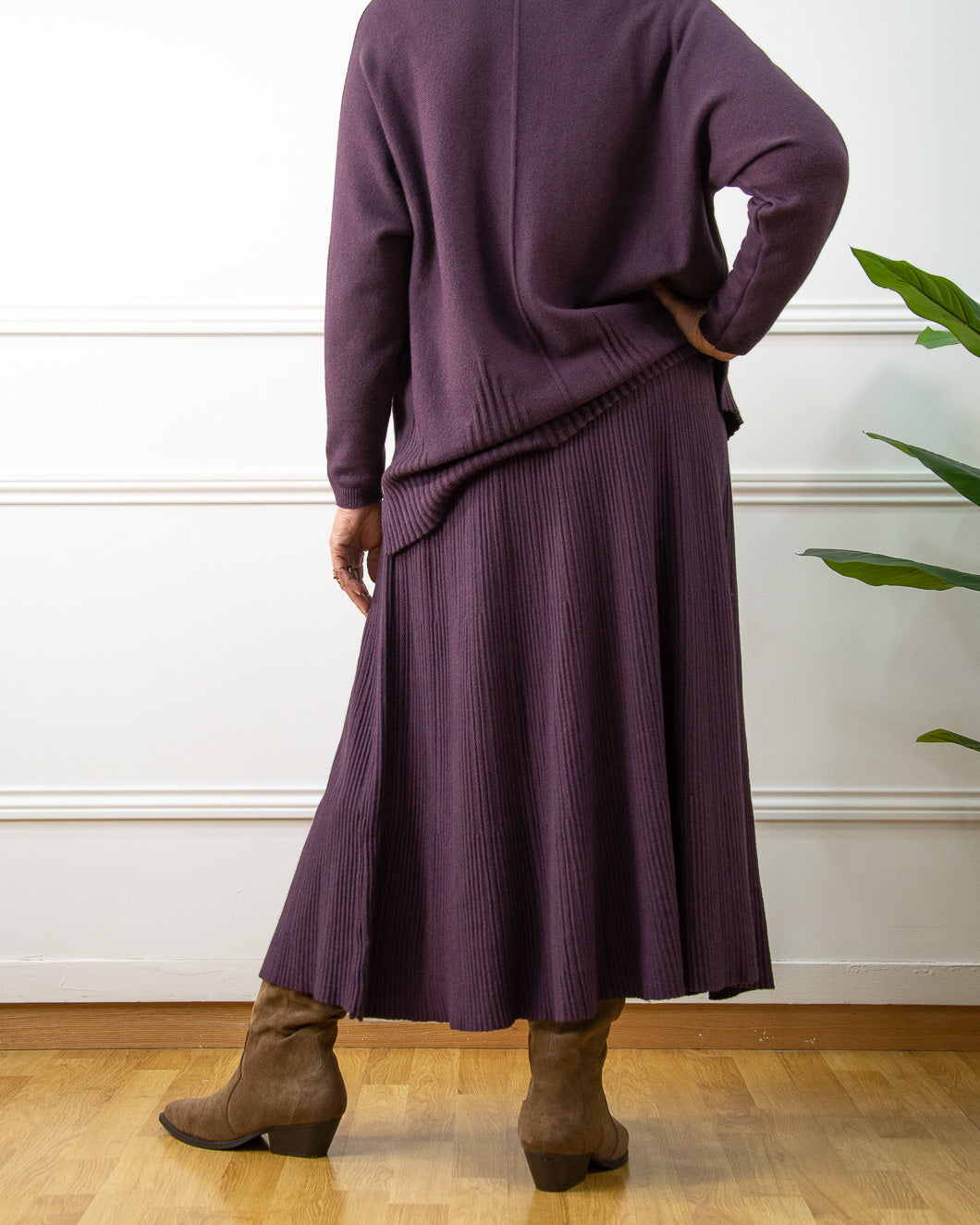 Falda evasé de punto, tiene mucha caída, no lleva forro , cinturilla de goma de 5cm, hace un mini dibujo de canalé.
