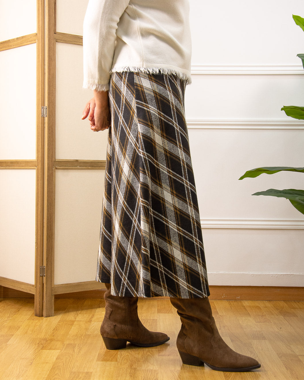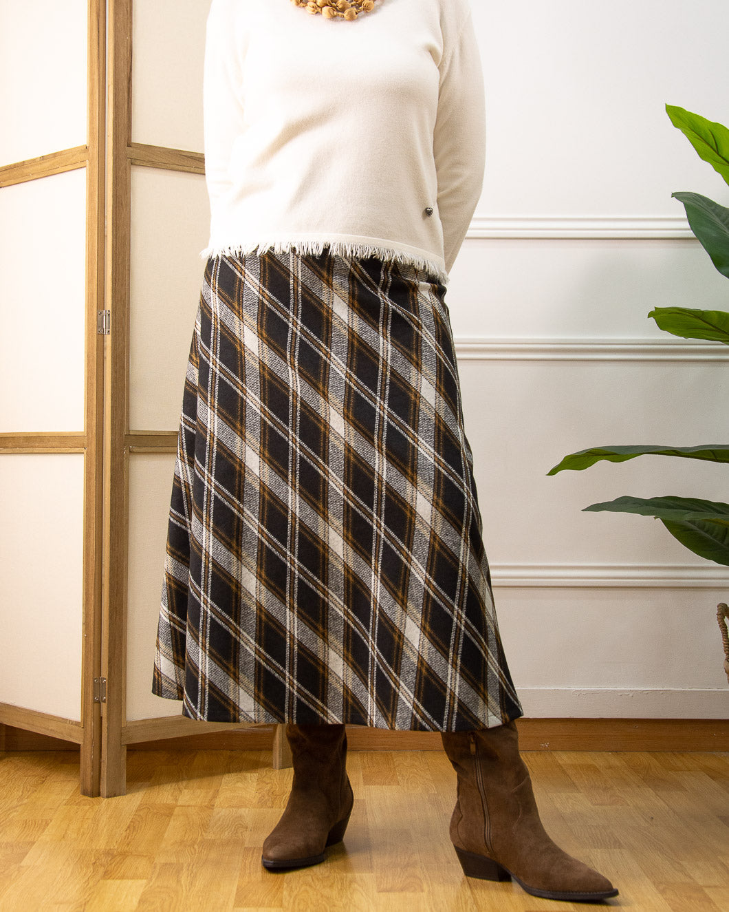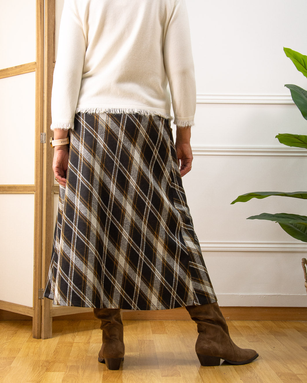 Falda evasé con goma de 4cm en la cintura, no lleva forro, el tacto es ultra suave, no se pega. Queda genial con la bota alta para conseguir un look en tendencia.