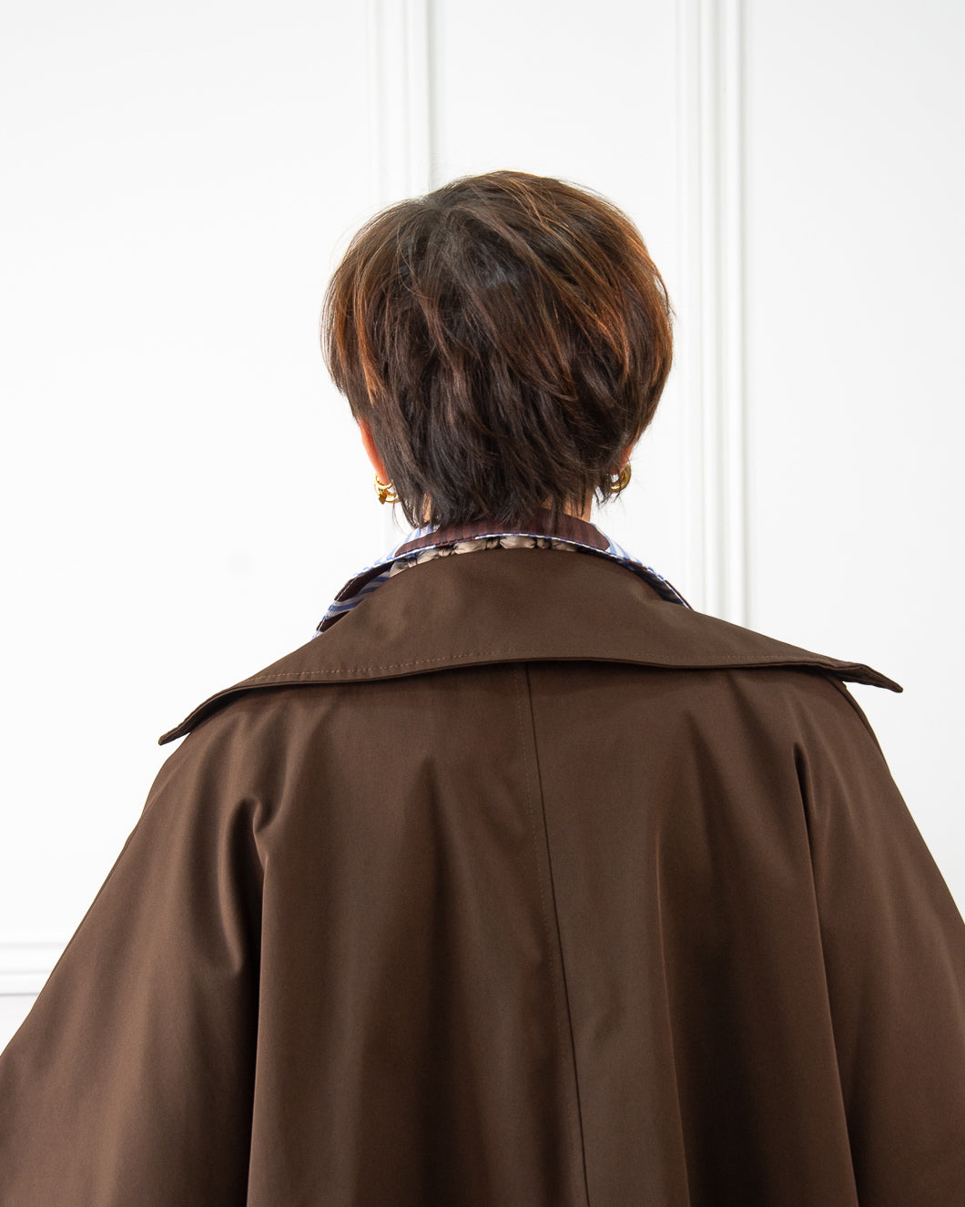 Gabardina tipo poncho, lleva seis botones delanteros con bolsillos y va cerrada por los laterales con dos botones que se pueden abrir. El cuello es de solapa, prenda muy oversize, ideal para entretiempo.